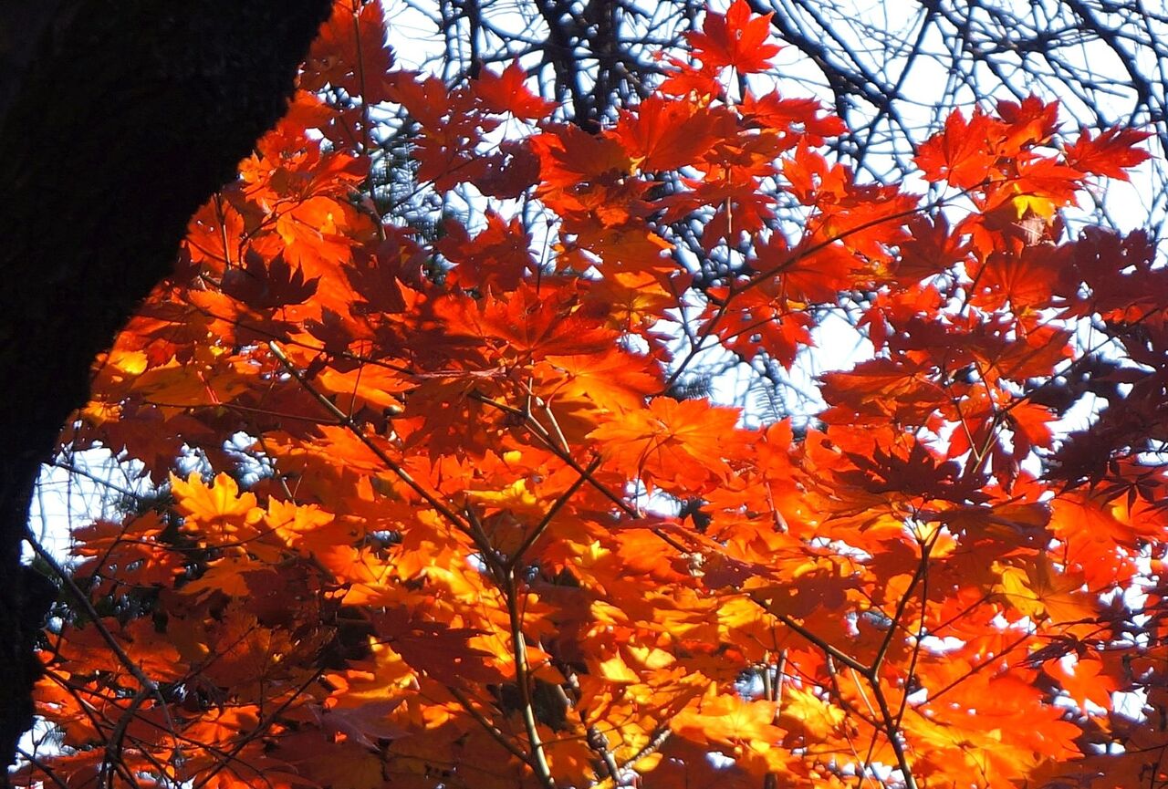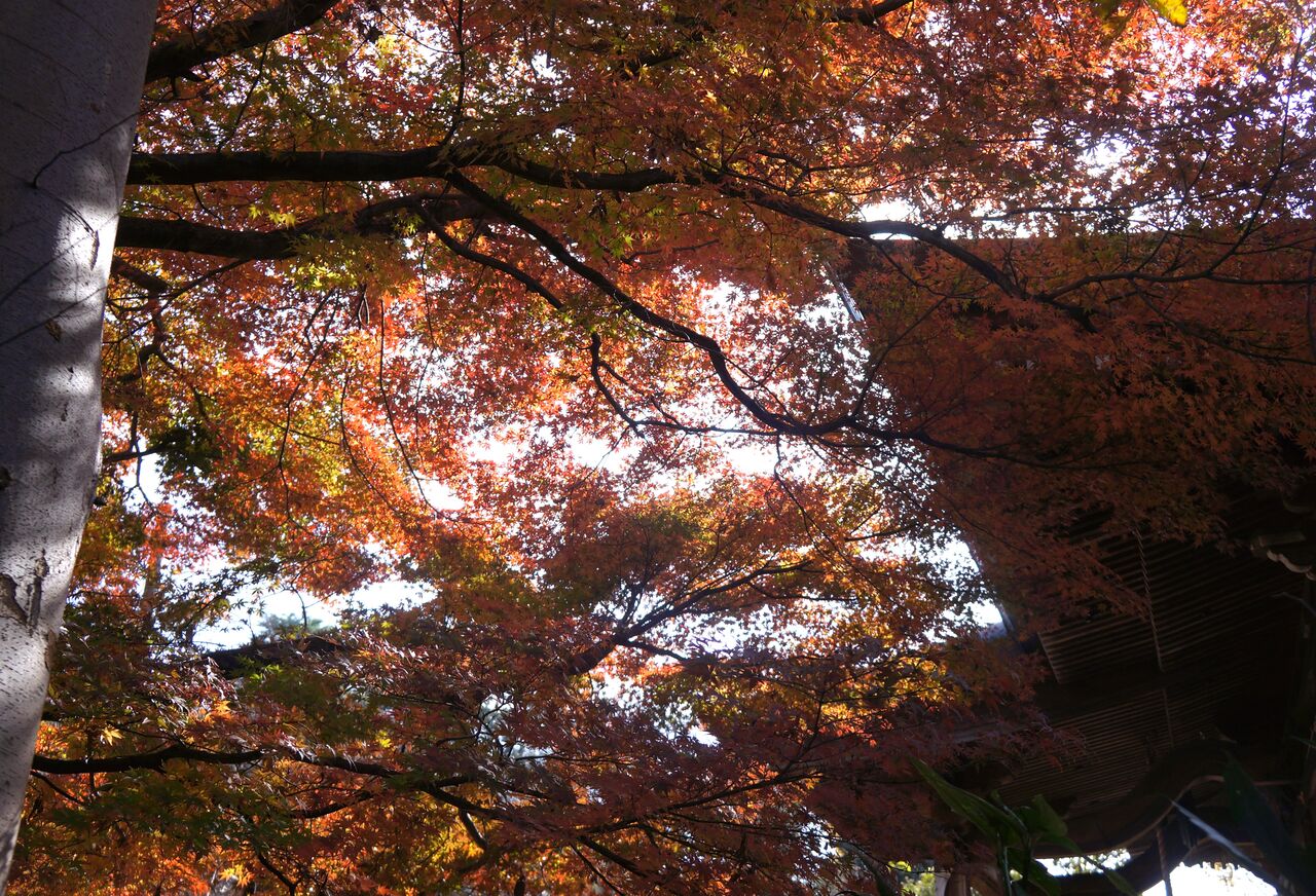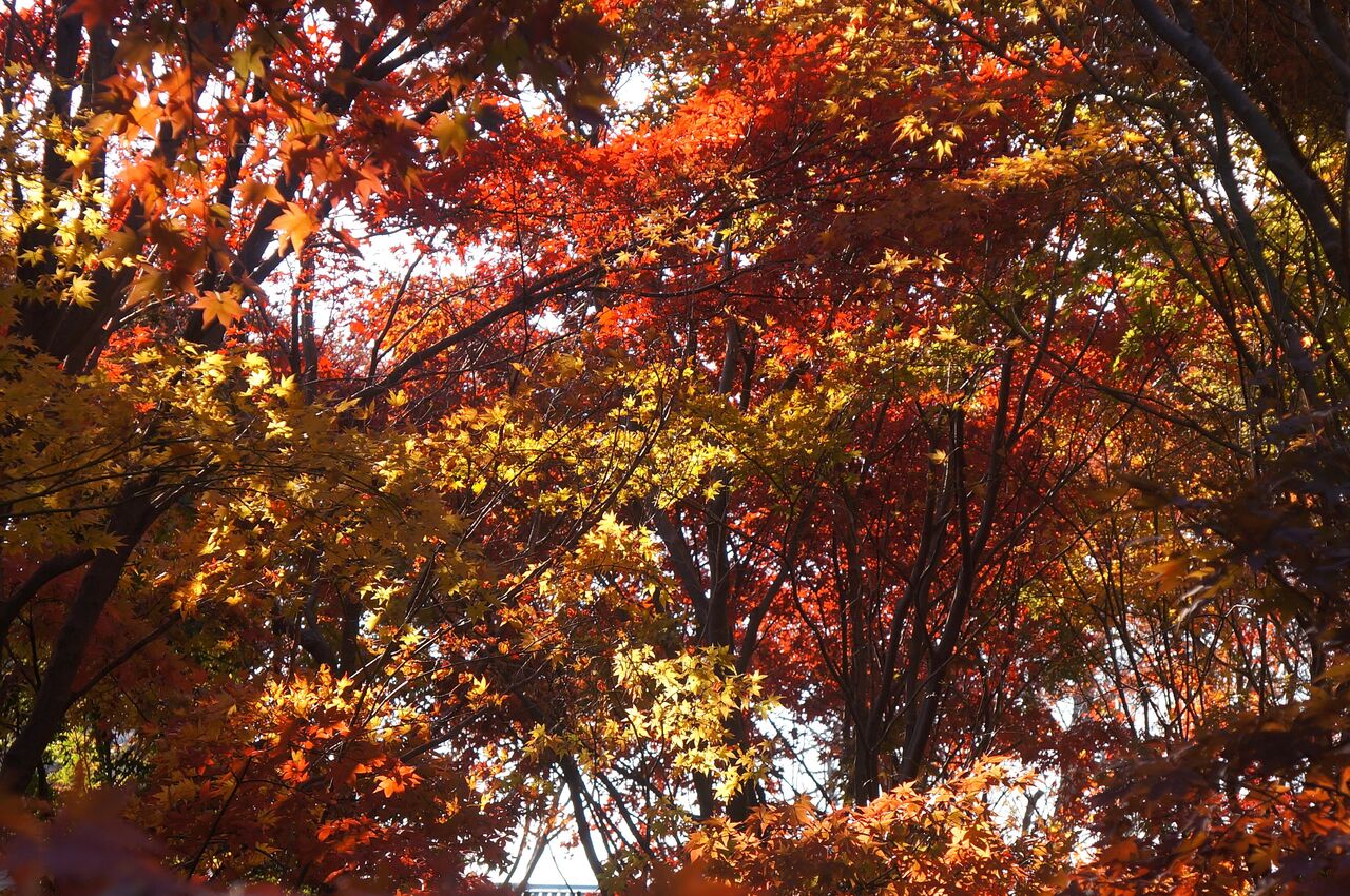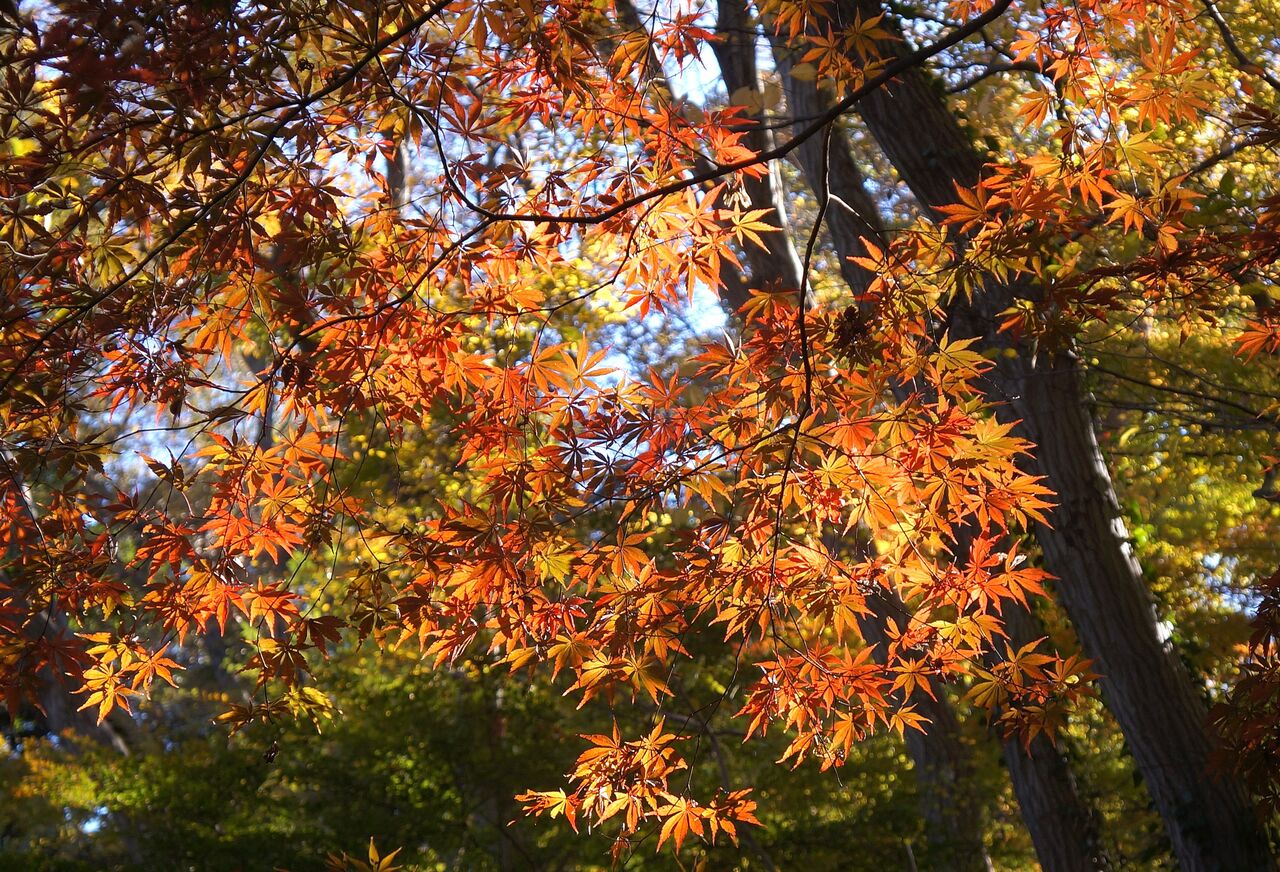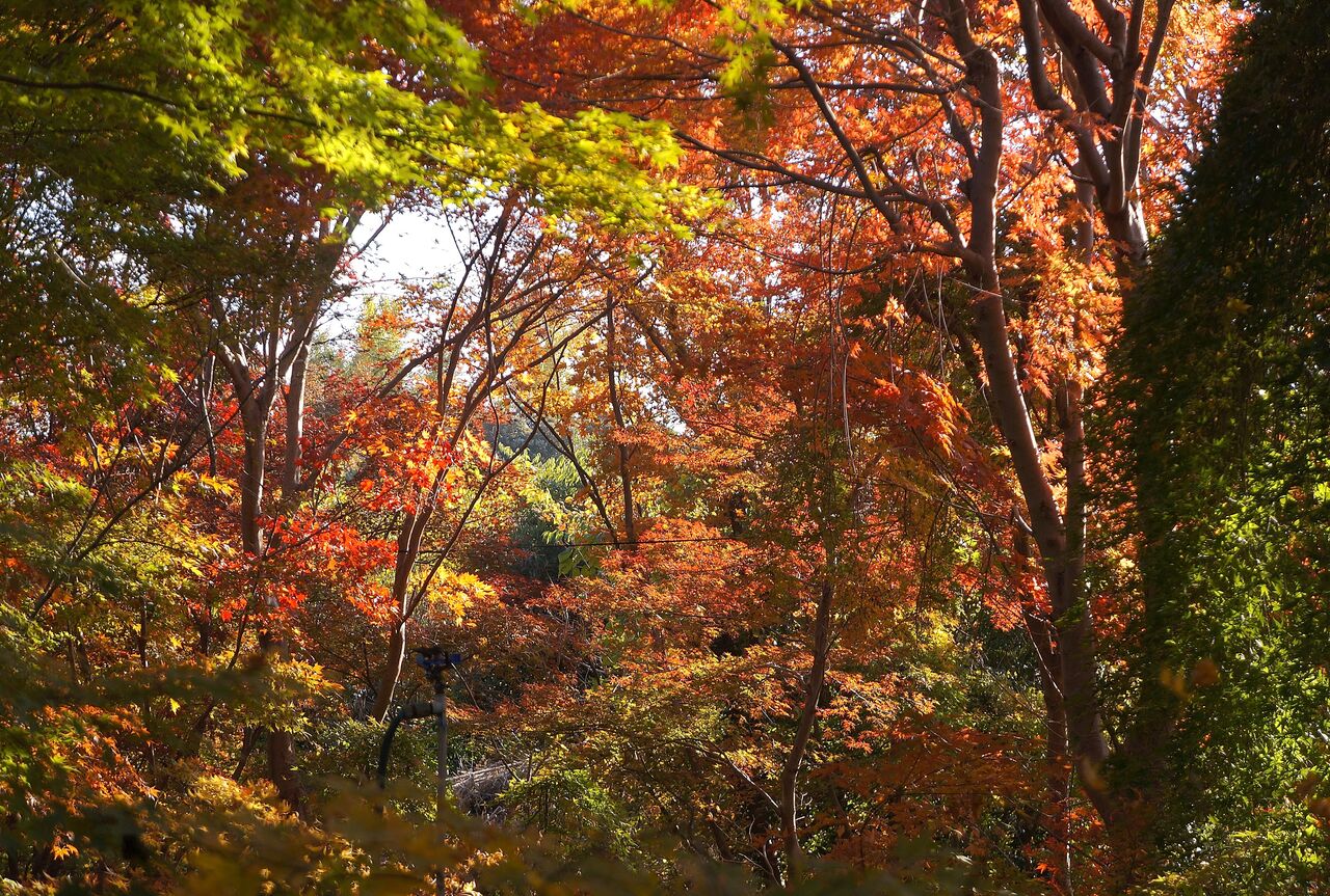 私がよく行く小林もみじ園さん、興禅院、植物振興センターは極狭いエリアにかたまってあります。いずれも台地の上にあります。なのに色付きの時季は異なります。なぜそうなるのかは判りません。品種が影響しているのは間違えないでしょうから、もみじ専門の植木屋さん小林もみじ園さんは品種が多く早く色付くものがあるのかもしれません。それと小林さんは頻繁に水やりをしているようです。最も遅く色付く弁財天は台地上と低地にまたがるのですが、ここはイロハカエデの小葉がほとんどです。そして森密度が高く、日当たり悪しです。でも当たると、ここが一番綺麗です。