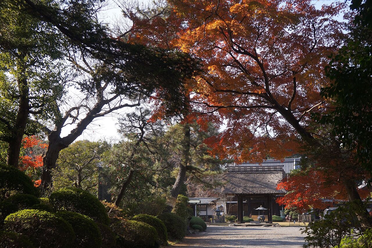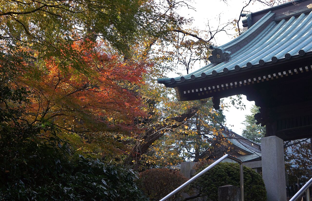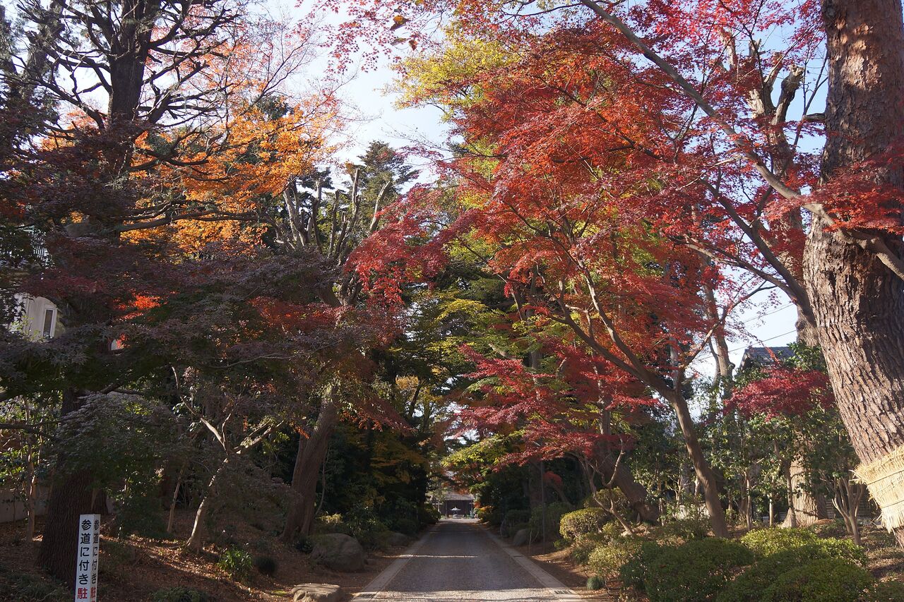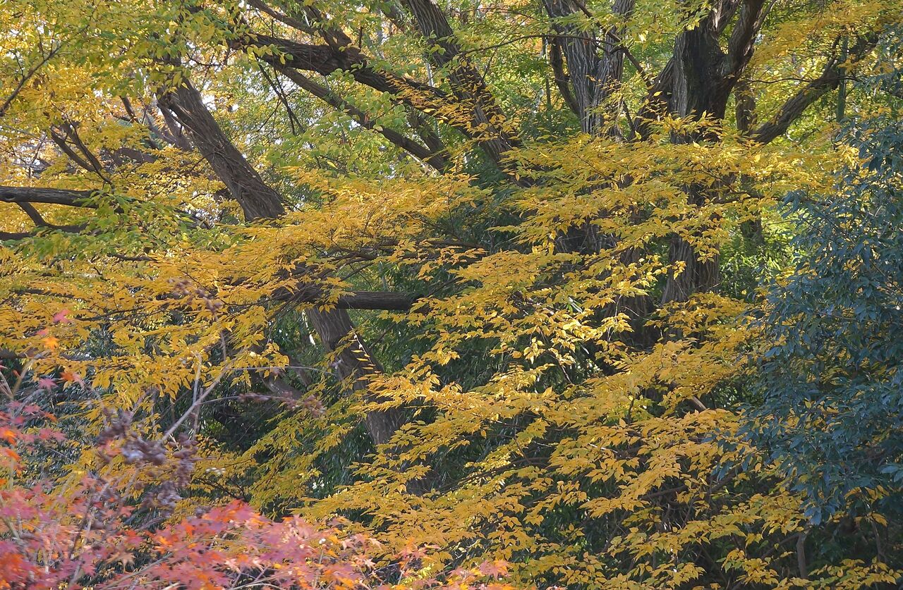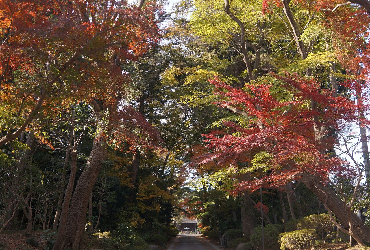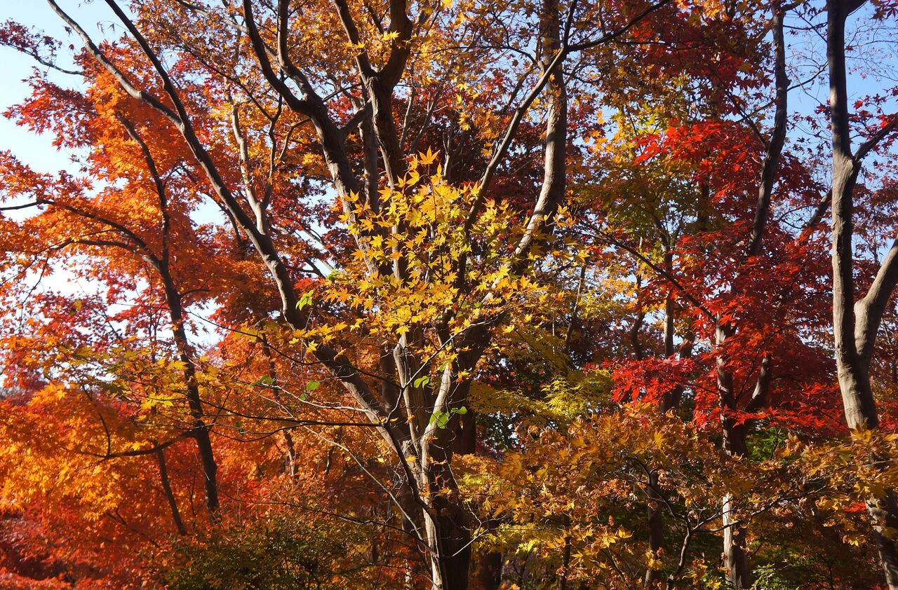 私がよく行く小林もみじ園さん、興禅院、植物振興センターは極狭いエリアにかたまってあります。いずれも台地の上にあります。なのに色付きの時季は異なります。なぜそうなるのかは判りません。品種が影響しているのは間違えないでしょうから、もみじ専門の植木屋さん小林もみじ園さんは品種が多く早く色付くものがあるのかもしれません。それと小林さんは頻繁に水やりをしているようです。最も遅く色付く弁財天は台地上と低地にまたがるのですが、ここはイロハカエデの小葉がほとんどです。そして森密度が高く、日当たり悪しです。でも当たると、ここが一番綺麗です。