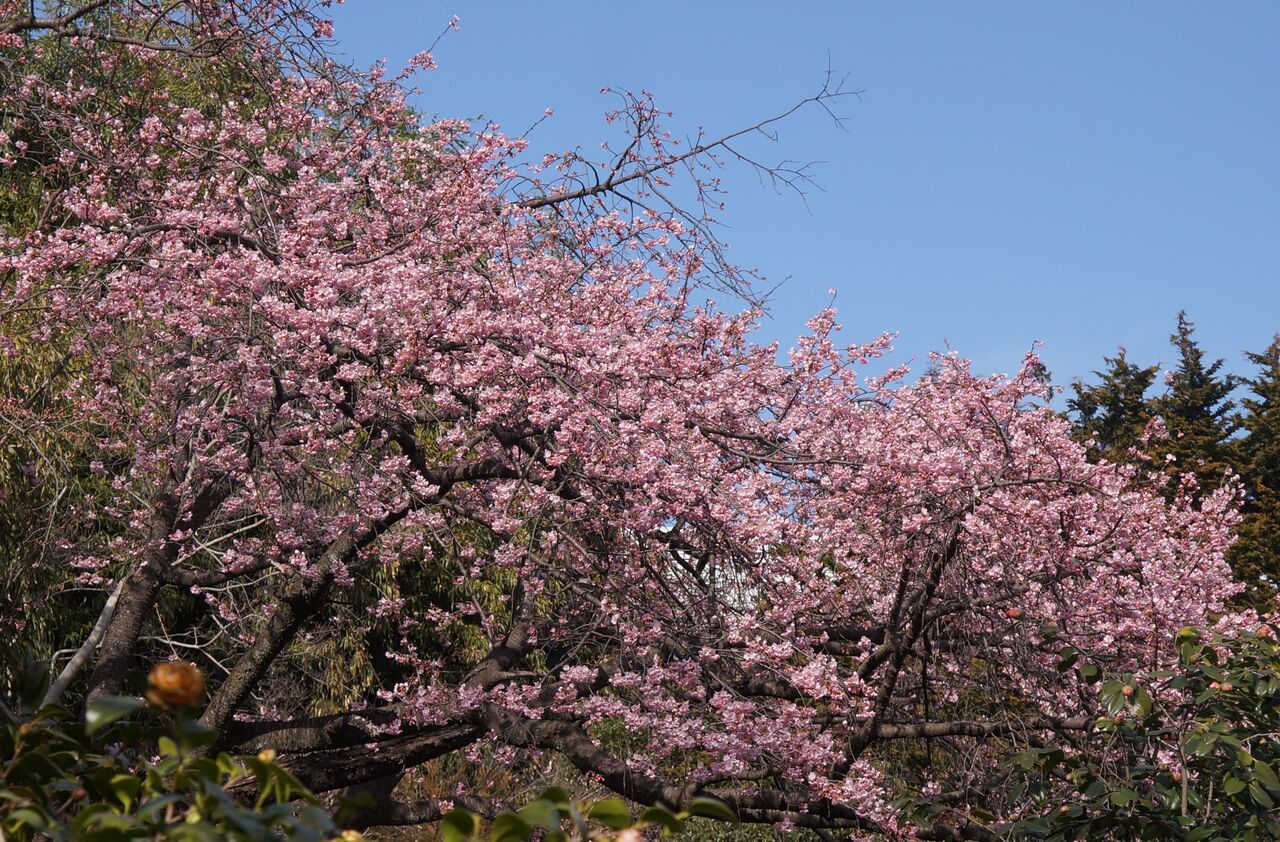 植物振興センター。椿寒桜。早くも鳥が集まり花をついばんでいる。