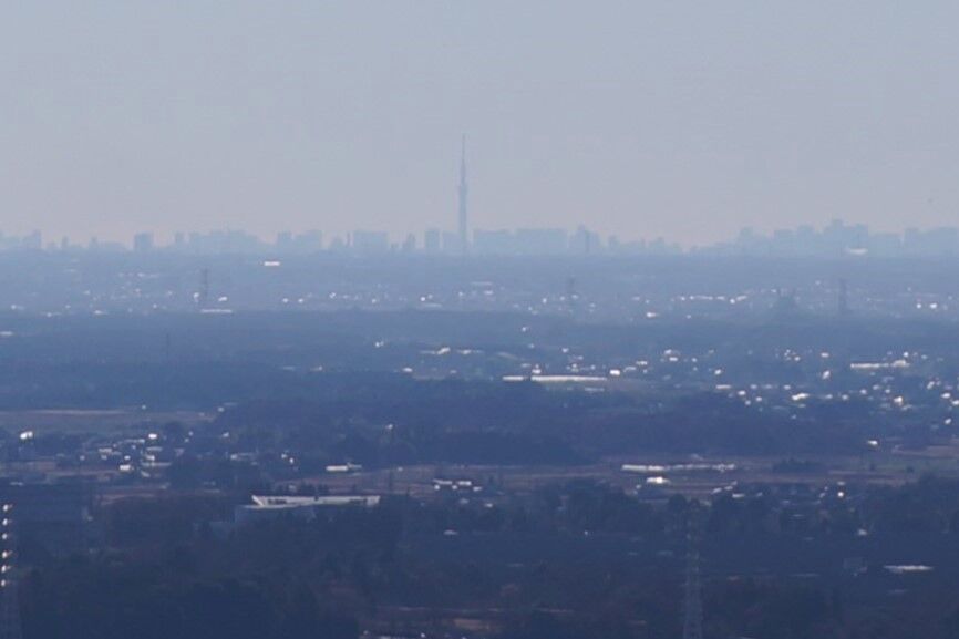 筑波山神社入口バス停に到着。道際よりスカイツリー。この時間、富士山は霞の中にうっすら状態。