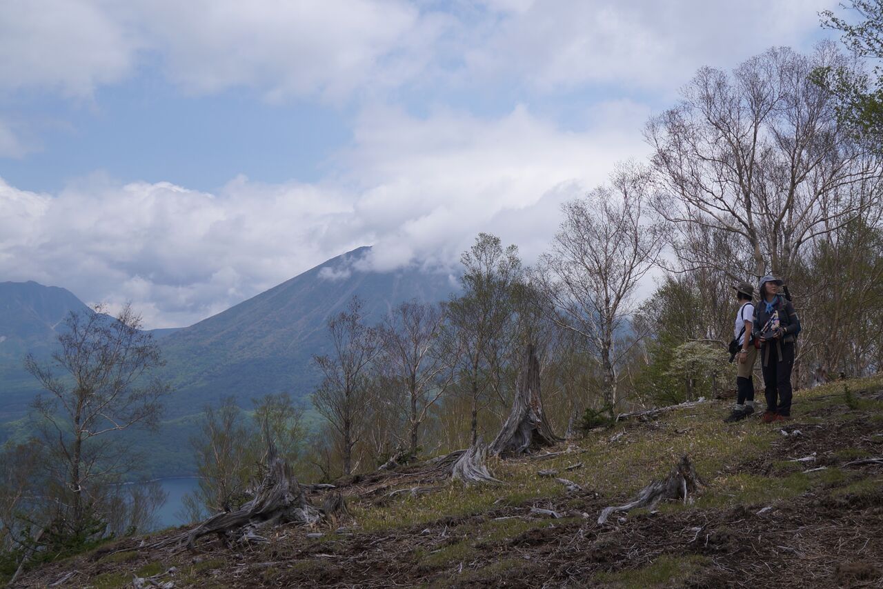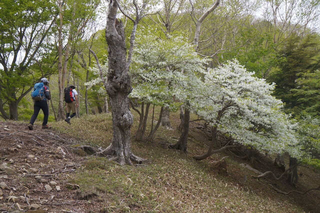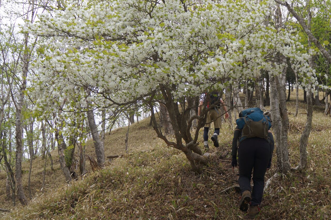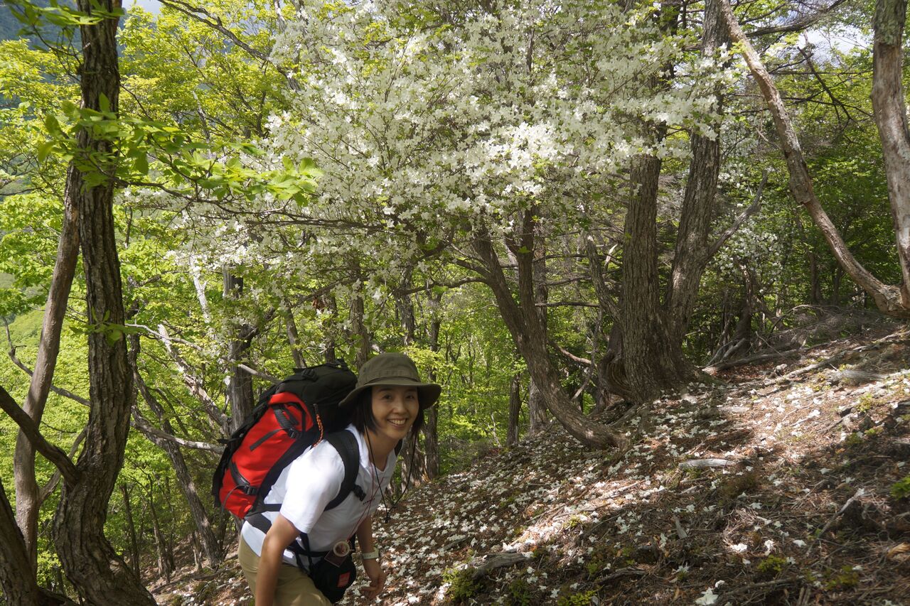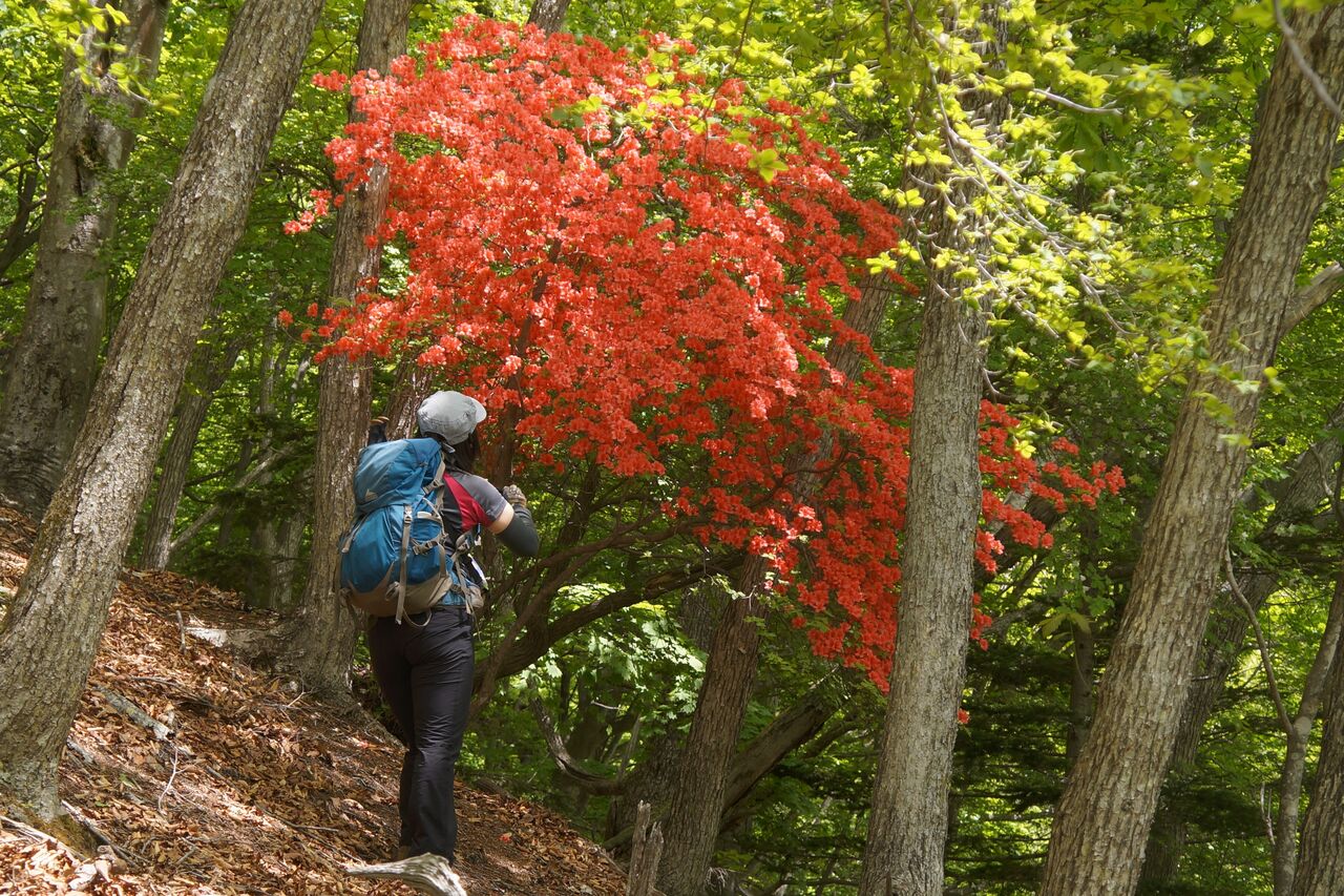 社山周辺のシロヤシオは南岸尾根から少し下がった所(大日尾根分岐~黒桧岳の北面)で濃密に繁茂しているのですが、今回のコースでは点在程度です。それでもちょうどよいタイミングみたいでした。できれば快晴の下で群青色の中禅寺湖を見てもらいたかったです。