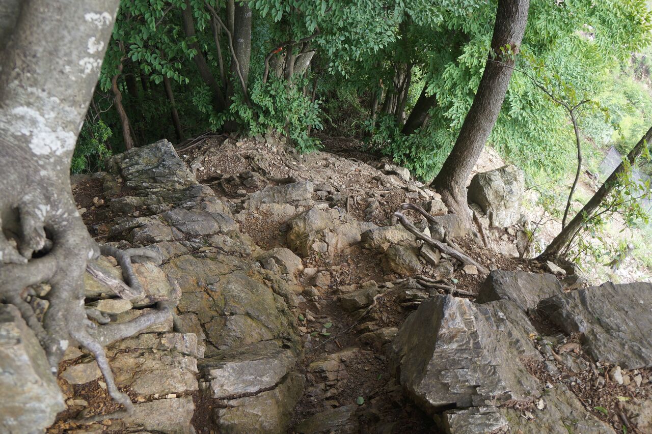 そして、思いがけず、急斜面。右足がシビレているので、この手の所は苦手。木につかまりながら下る。