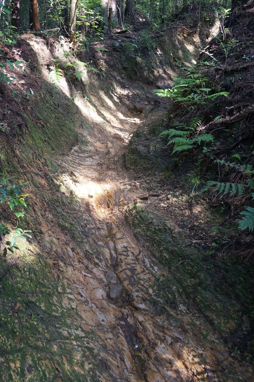 なんだか掘れた岩盤むき出しの道となる。