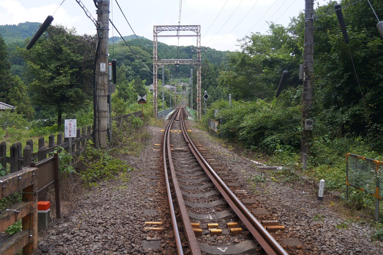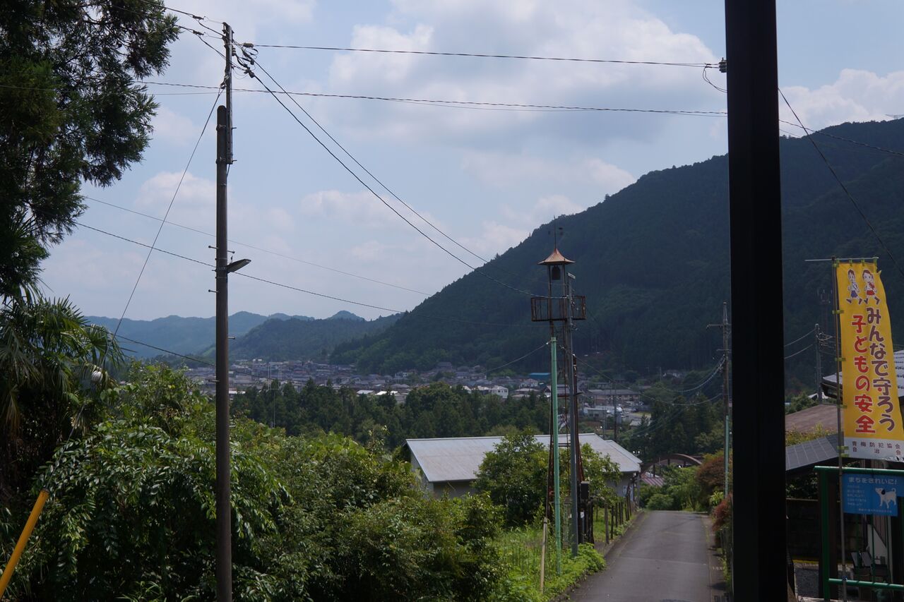 御嶽駅を少し戻るように進み、すぐに狭い小道を登ると踏切があった。踏切を渡ると案内標識があり、それに従う。