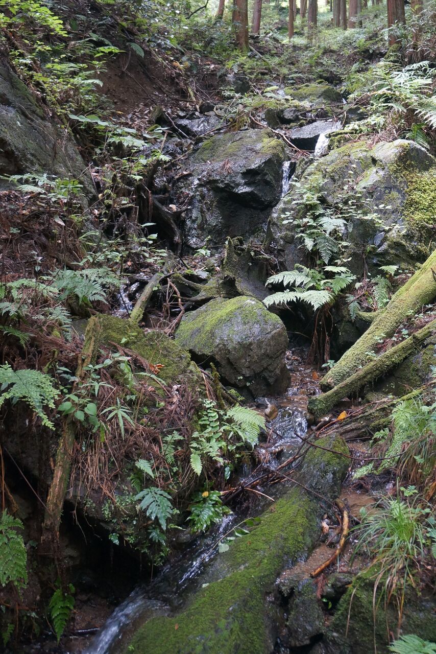 やがて沢型に降り着く。小さな石の下から、水が湧きだしていた。