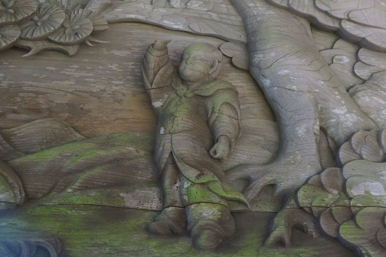 青渭神社の彫り物。全体を金網で囲ってあるので、金網にレンズを突っ込んで撮った。