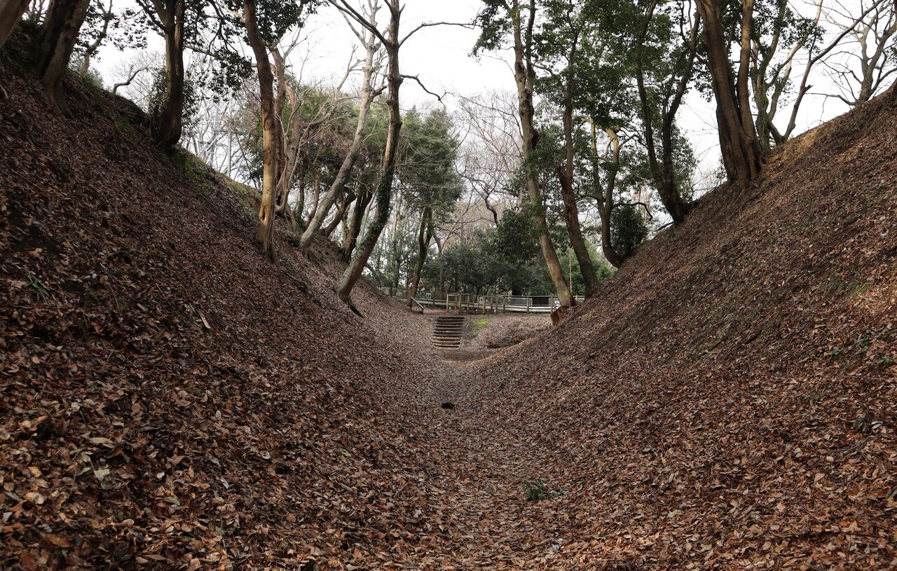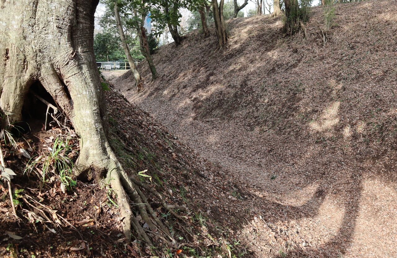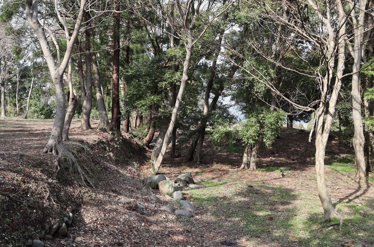 稲荷森付近の掘。堀の外側には掻き上げ土塁。