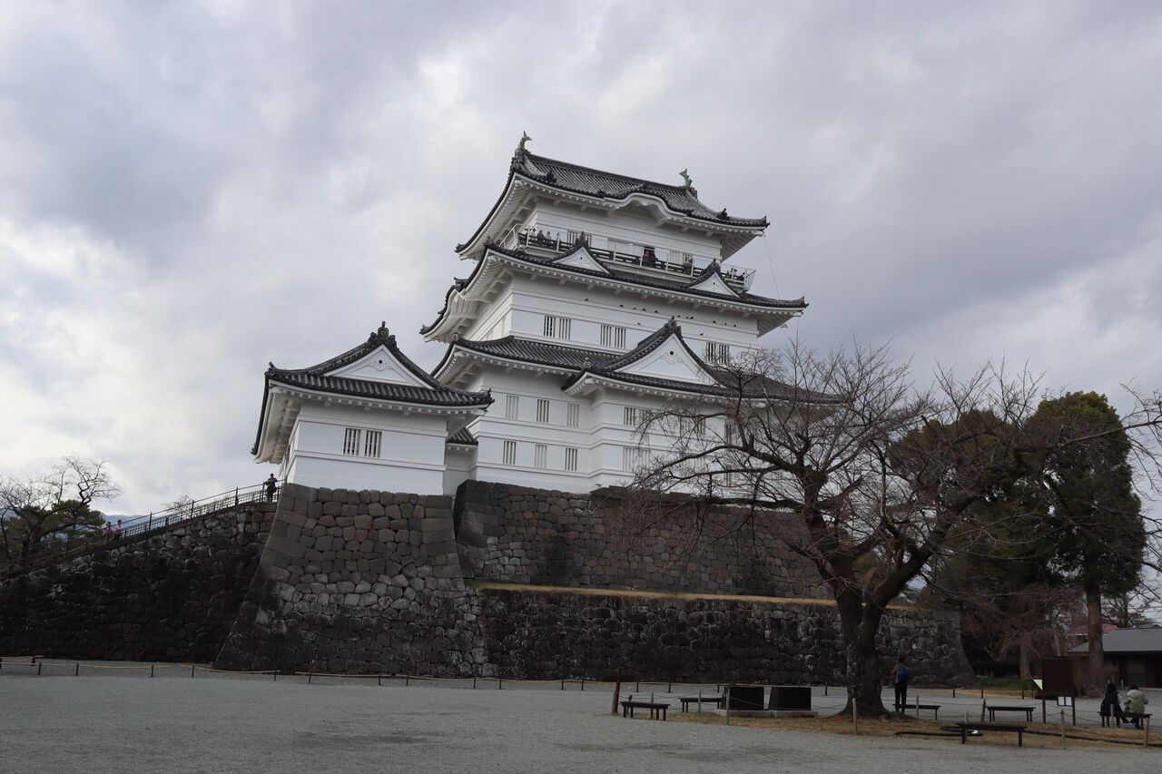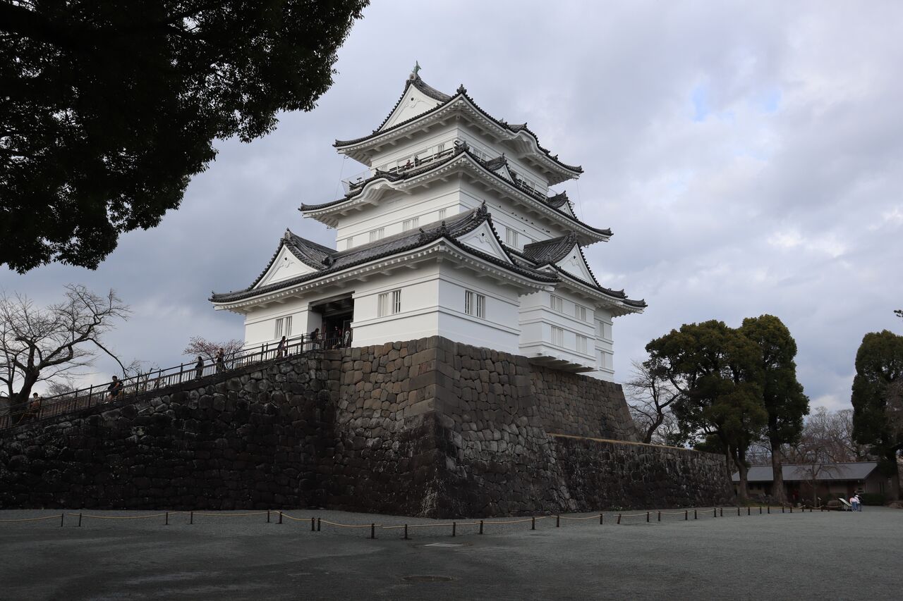 「三の丸外郭新堀土塁」「八幡山古郭東曲輪」などの見学スポットを見過ごし、JR東海道線を渡ると、小田原城天守閣が間近に見えた。