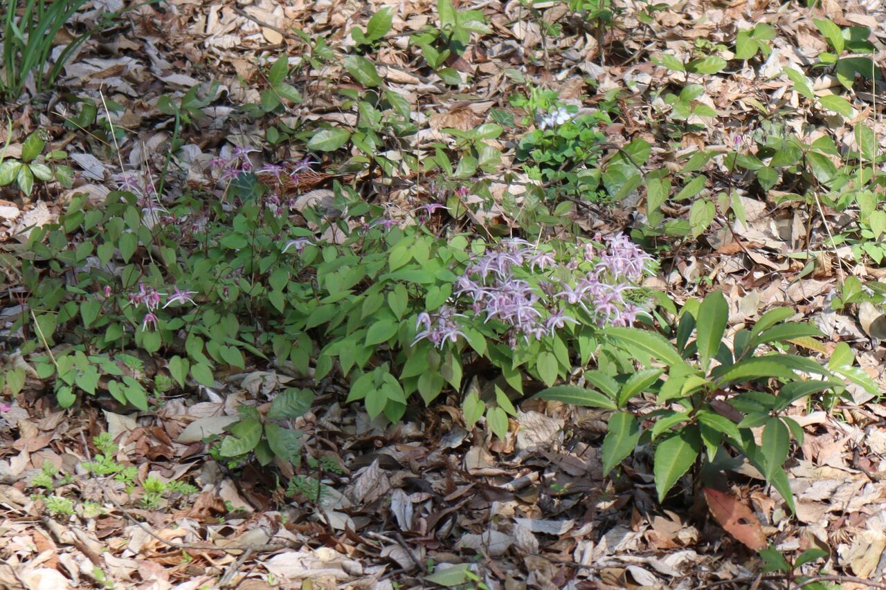 一輪草自生地。イカリソウ(紫)。