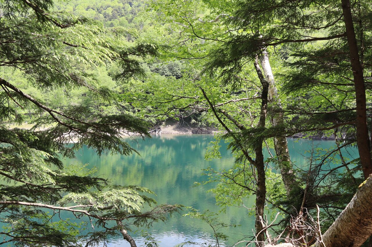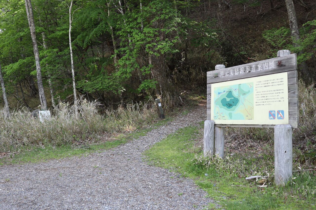 こんな感じの道をユルユルと登る。蓼ノ湖は樹間からチラリと見える程度。