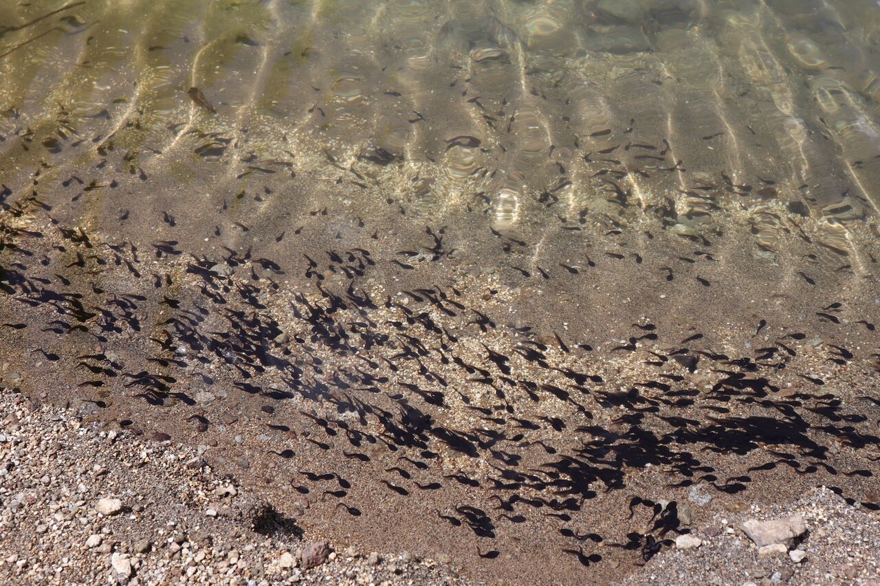 切込湖の東端にて。岸辺には無数のオタマジャクシが群れておりました。黒いヤツ。