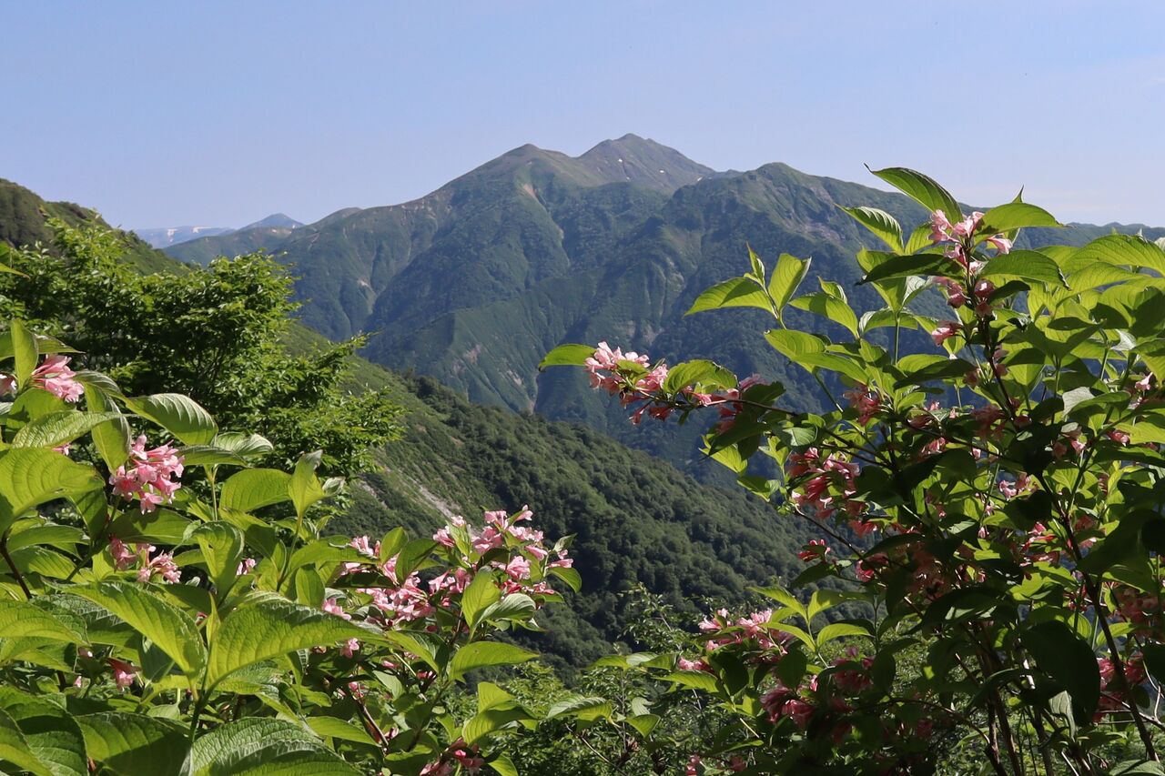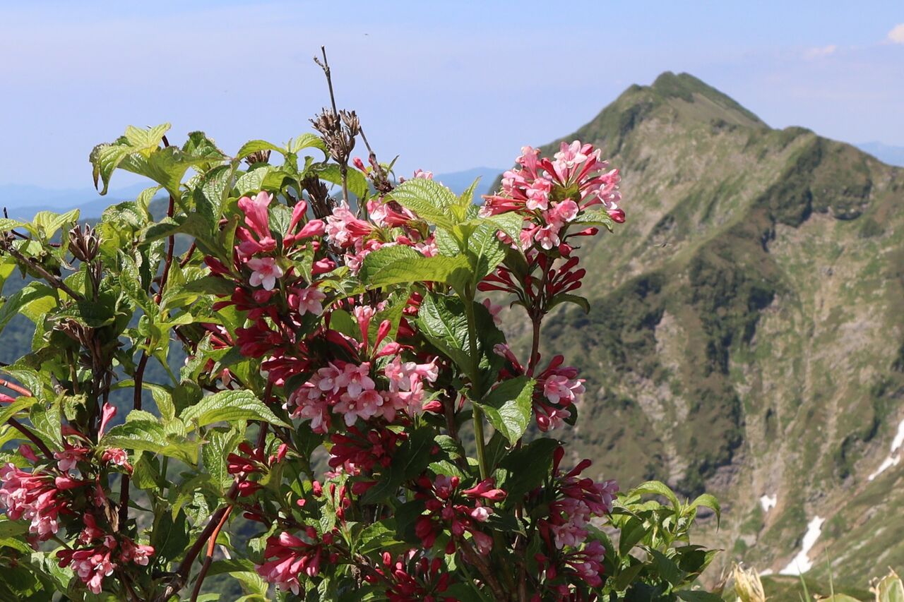 タニウツギと(左から)笠ヶ岳、朝日岳、白毛門。今日初めて知りました。