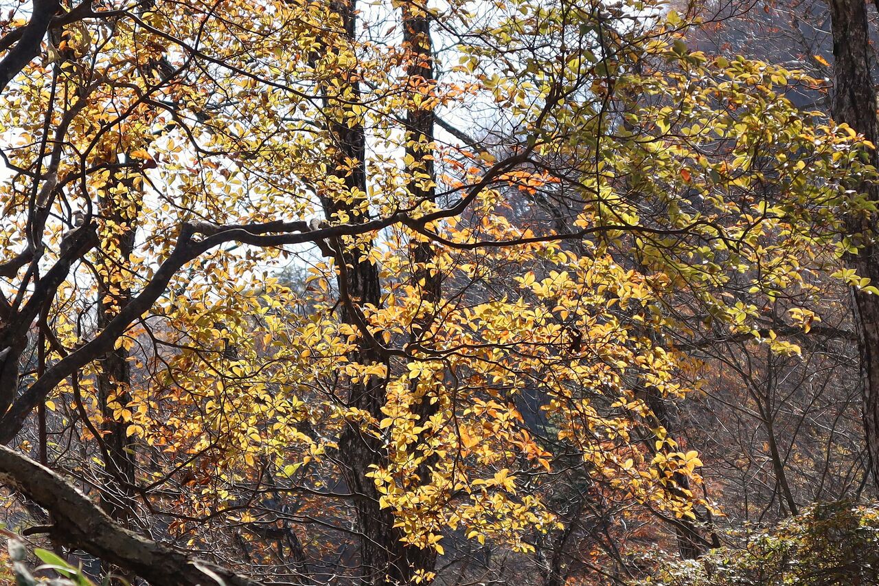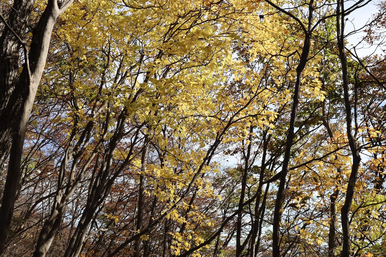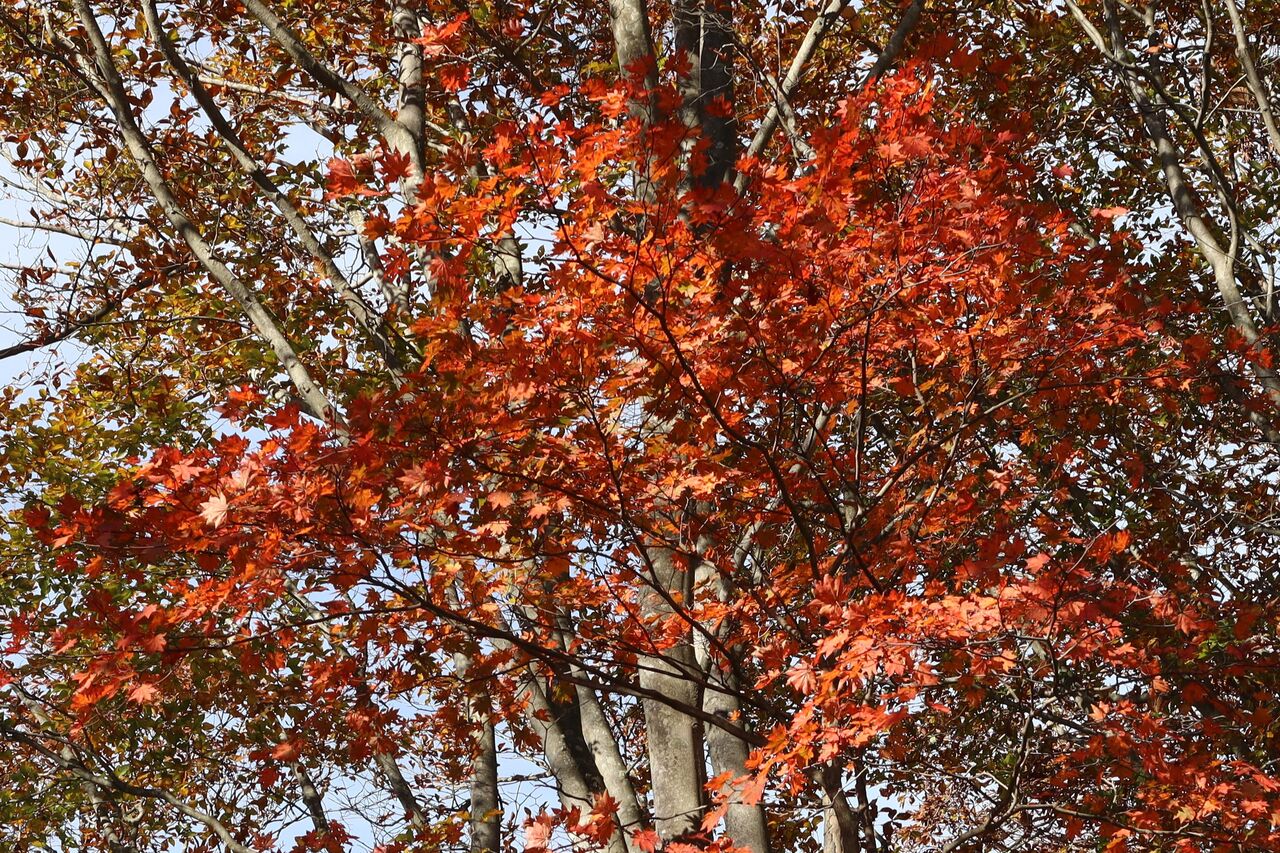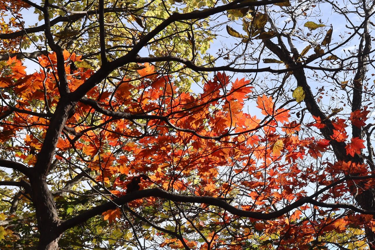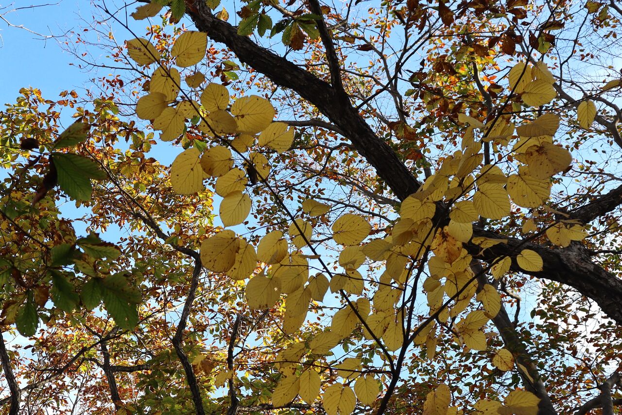 今回は、本文には書いておりませんが、いいとこ撮りの傾向が大です。ツツジが昨年ほどでは無いにしろ葉っぱが茶色く縮れてしまっていました。半月山の斜面も、例年赤いものがポツポツ見えるのですが、残念な状態のようでした。それでもハウチワカエデの多くは真っ赤になっていました。ツツジ紅葉がダメとなると、三ノ宿山や大木戸山の方がカエデ類が多いかもしれません。