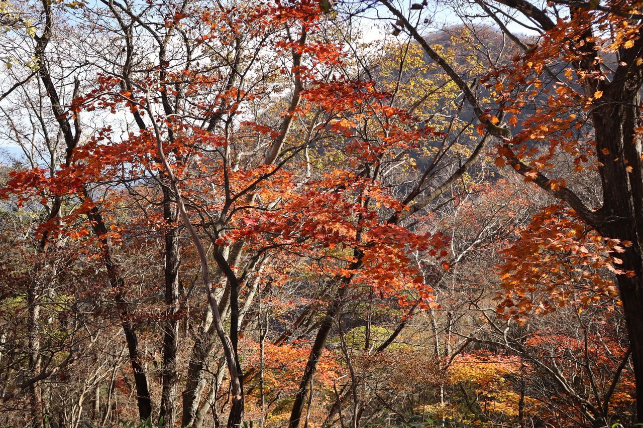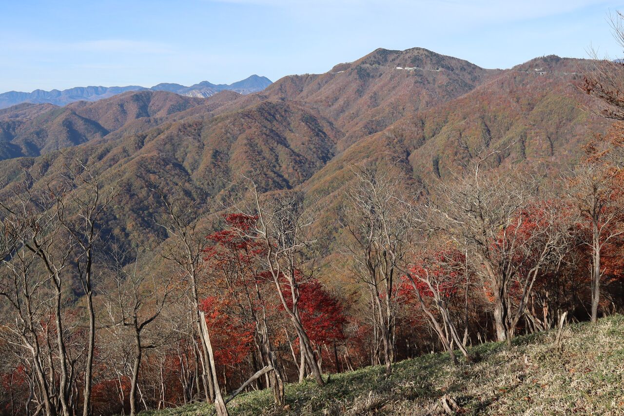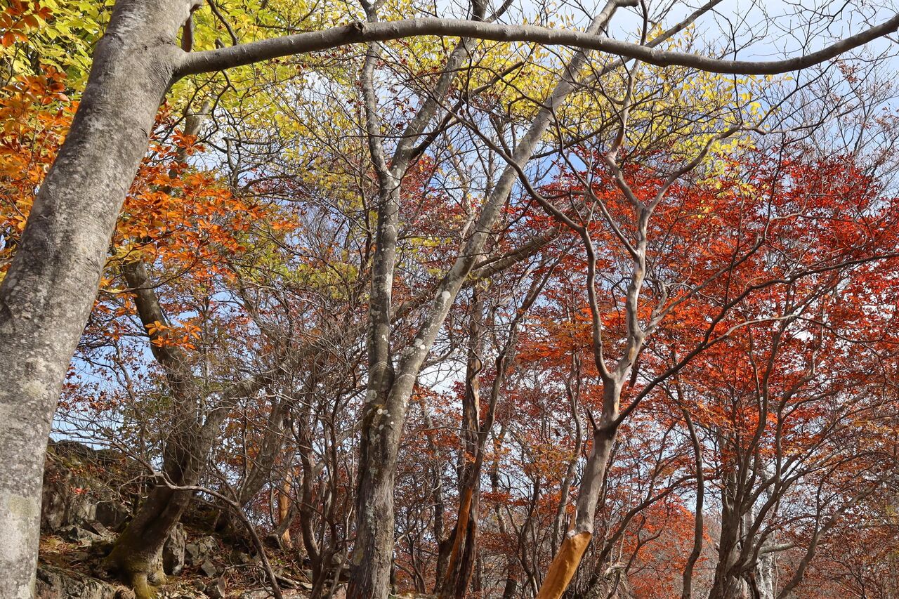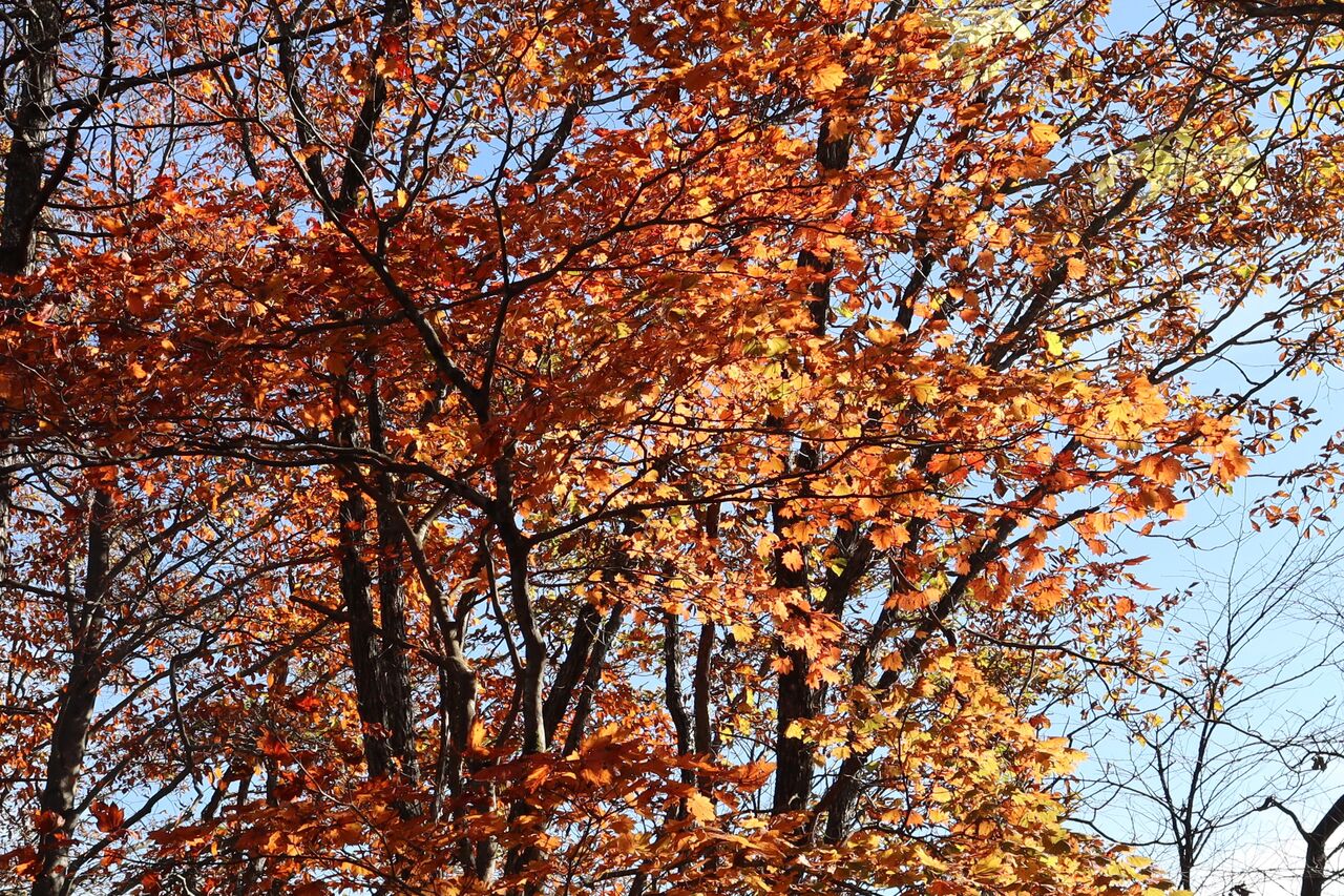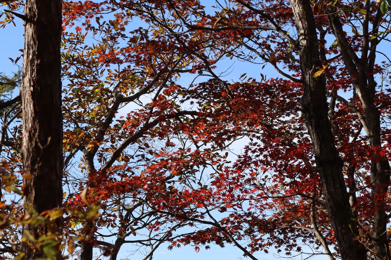 今回は、本文には書いておりませんが、いいとこ撮りの傾向が大です。ツツジが昨年ほどでは無いにしろ葉っぱが茶色く縮れてしまっていました。半月山の斜面も、例年赤いものがポツポツ見えるのですが、残念な状態のようでした。それでもハウチワカエデの多くは真っ赤になっていました。ツツジ紅葉がダメとなると、三ノ宿山や大木戸山の方がカエデ類が多いかもしれません。