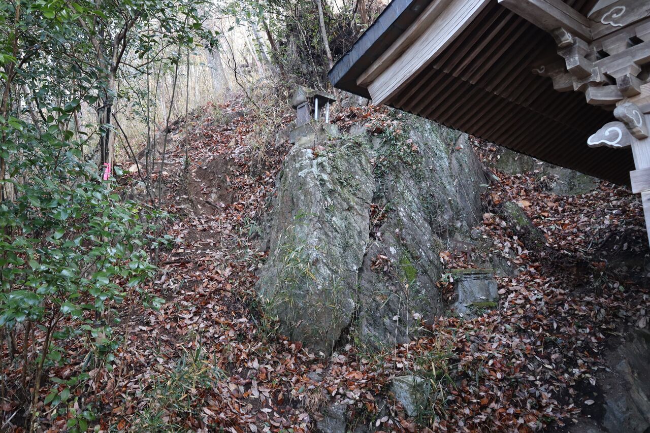 社の裏に急な踏み跡があった。ピンクリボンが目に入り、登山道と確信した。石の右側を選択し一歩を踏み出したところでフクラハギに激痛が走った。