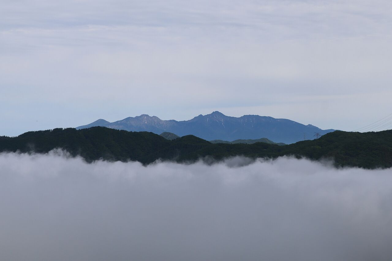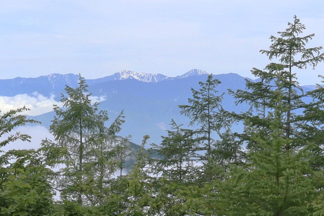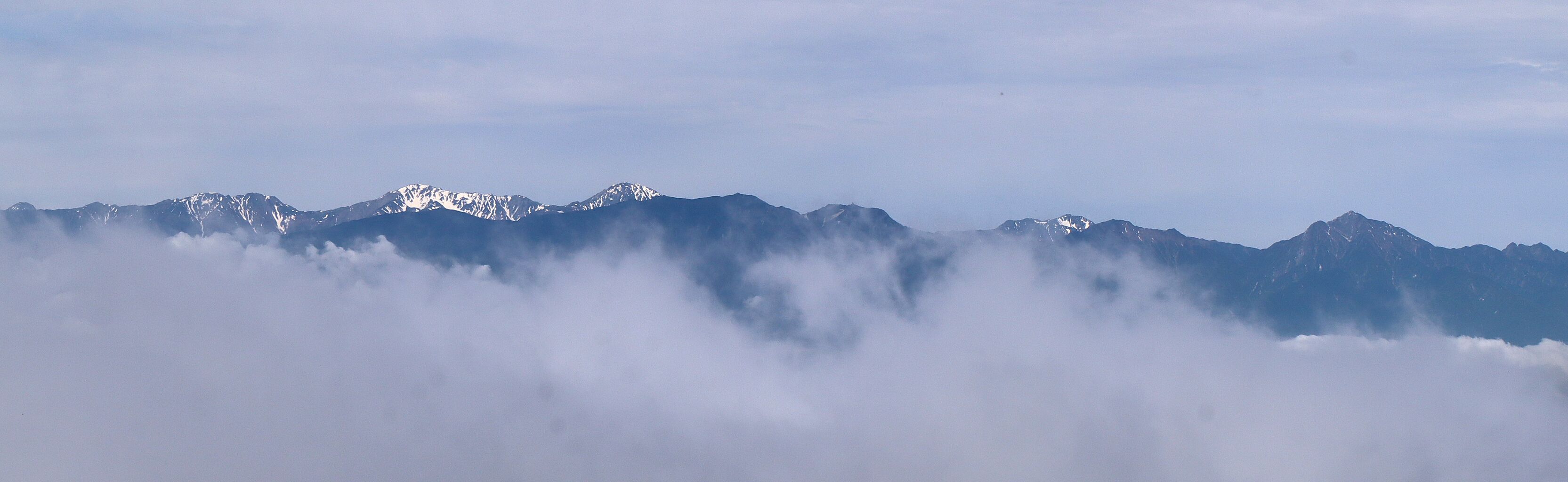 左の三角が聖岳。鞍部を介して赤石岳かな。その右に悪沢岳。