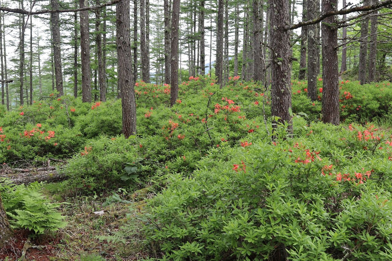 おそらく1653m峰付近。カラマツ林の中にレンゲツツジが咲いている。