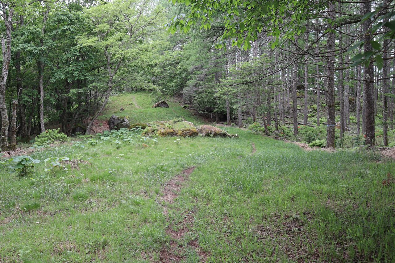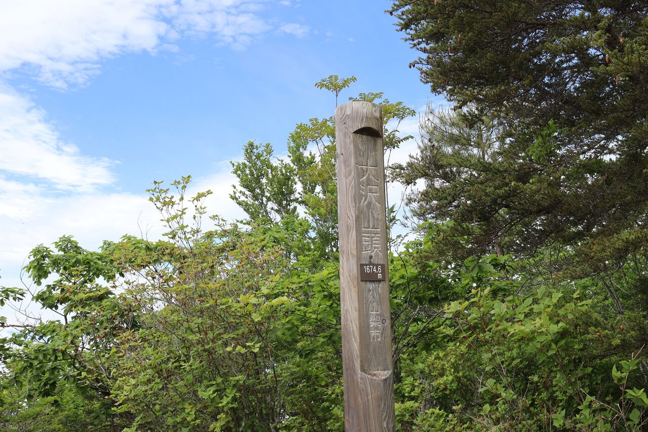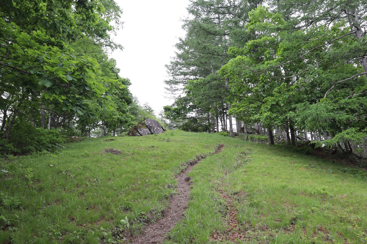 幕岩を降りて、すぐ先に大沢の頭(大沢山)。木々に囲まれて展望無し。この時は青空が見えていた。