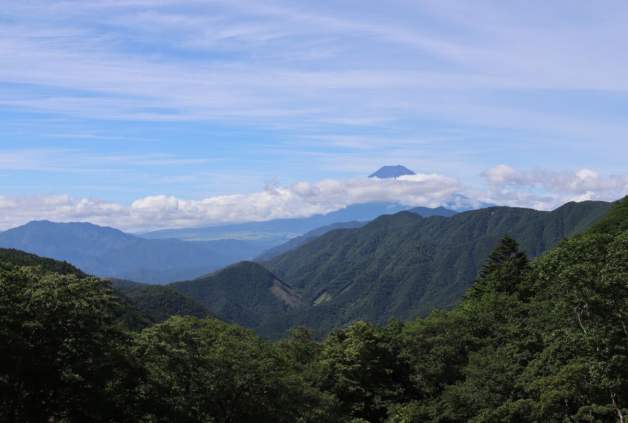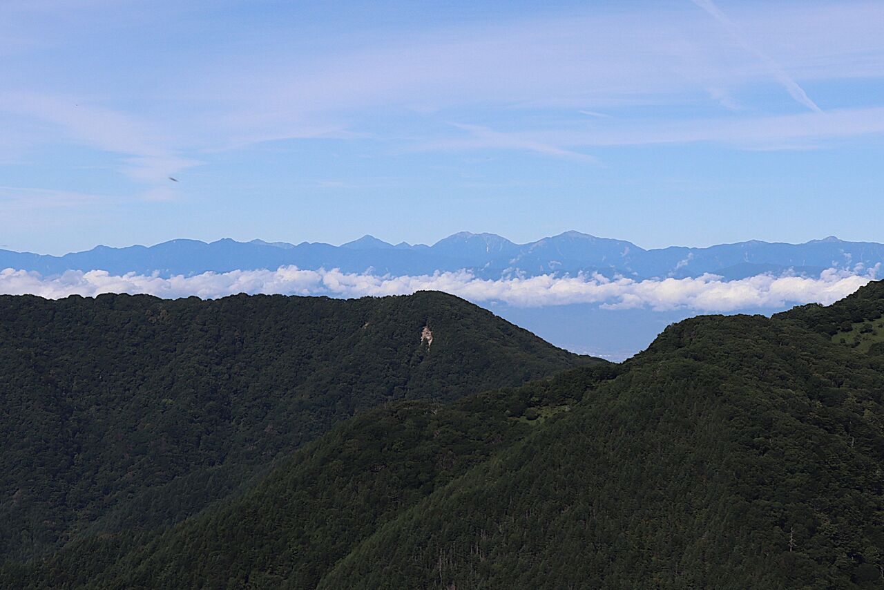山頂を下って、展望地。山頂からは見えなかった南アルプスがよ~く見える。手前のV字の切れ込みは湯ノ沢峠かな?