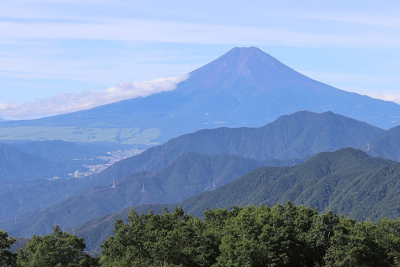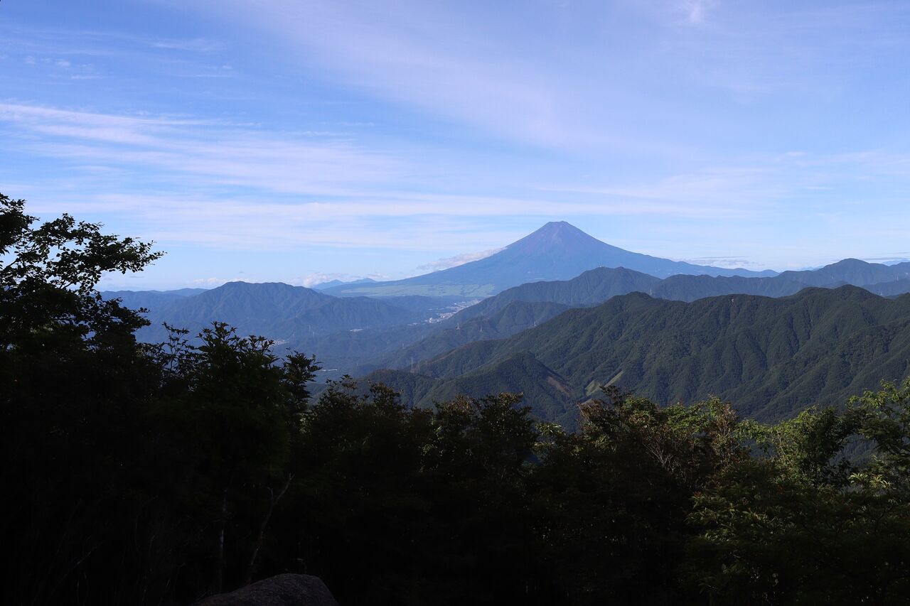 最初の展望地。富士山の真下に三ツ峠山、その手前に滝子山から続く小金沢連嶺。
