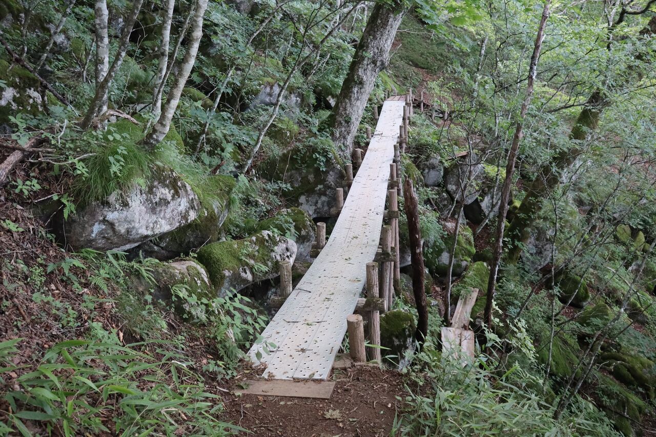 はじめは山腹のトラバース道をユルク登る。アルミ橋。