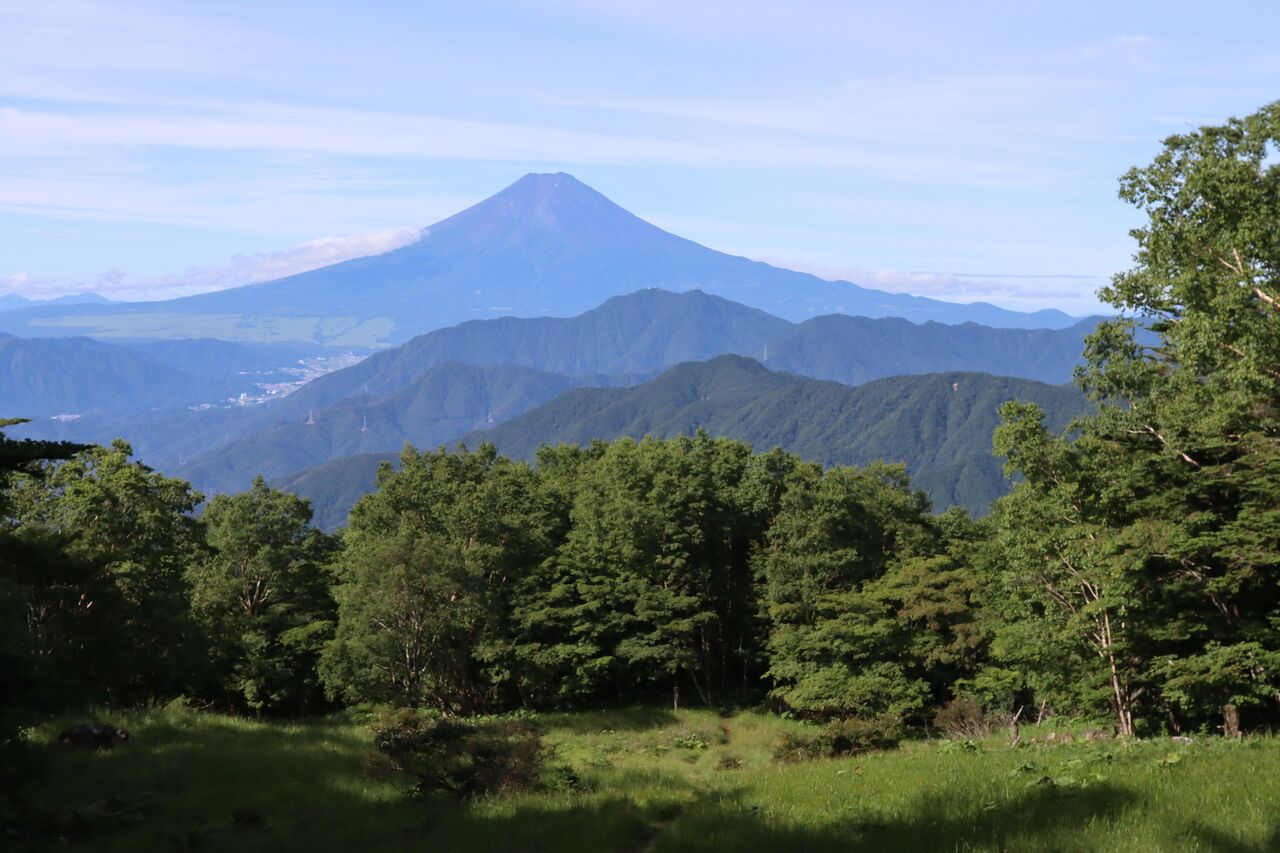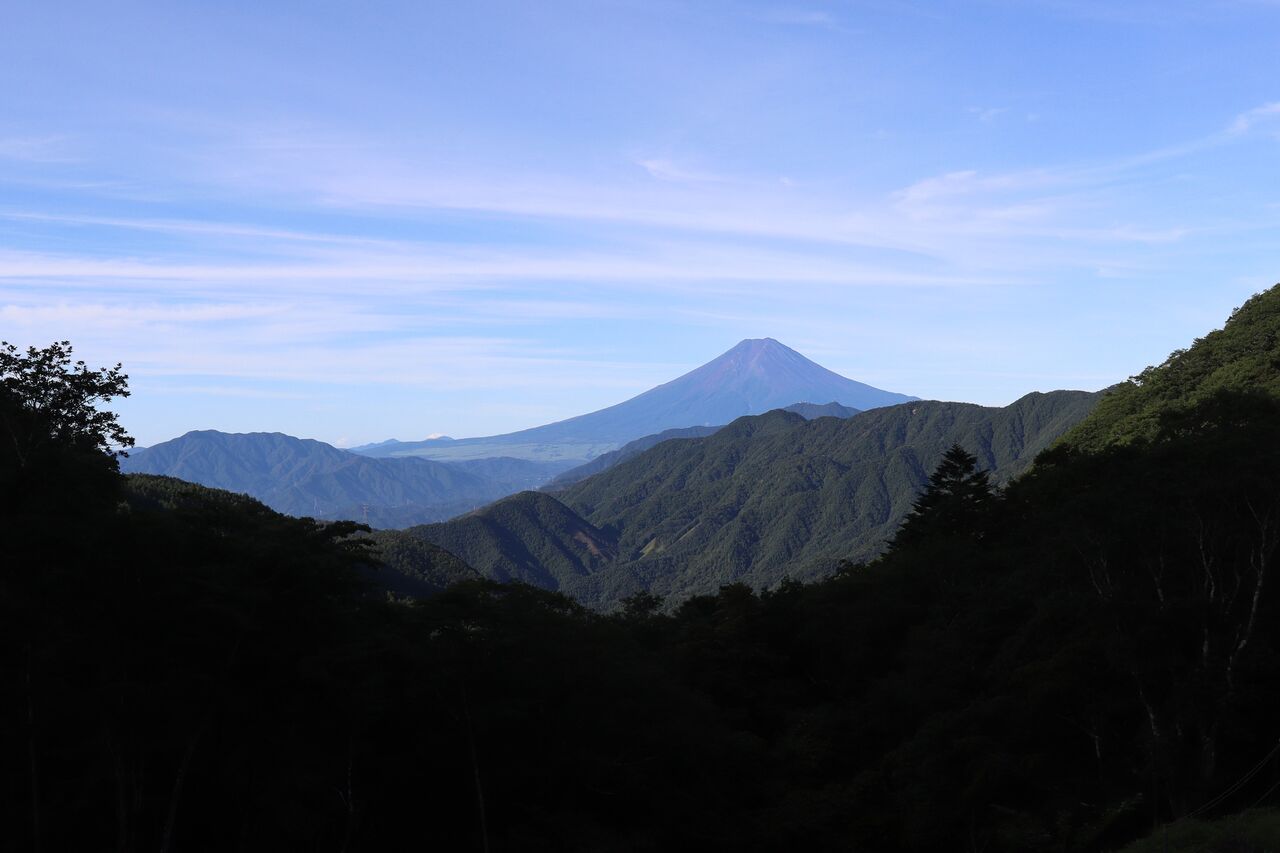 朝7時。大峠にて。左に杓子山。富士山の真下が滝子山。