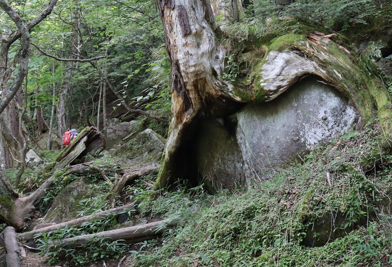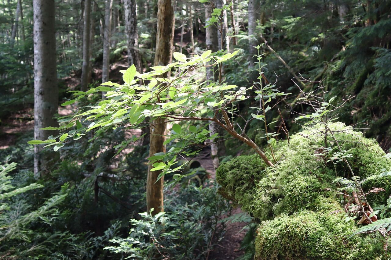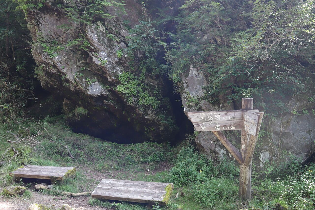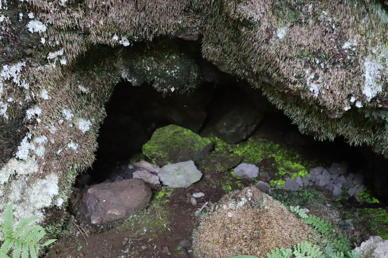 ヒカリゴケは小峠の少々手前に極小さな岩室の中にありました。道の右側です。注意して歩けば緑色のものが岩陰に見えるので見つかると思います。