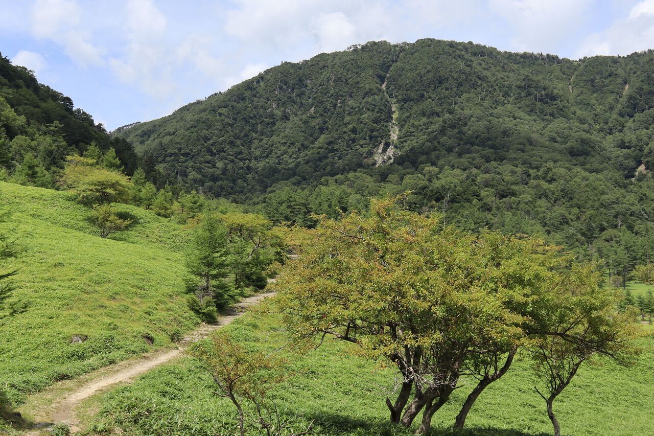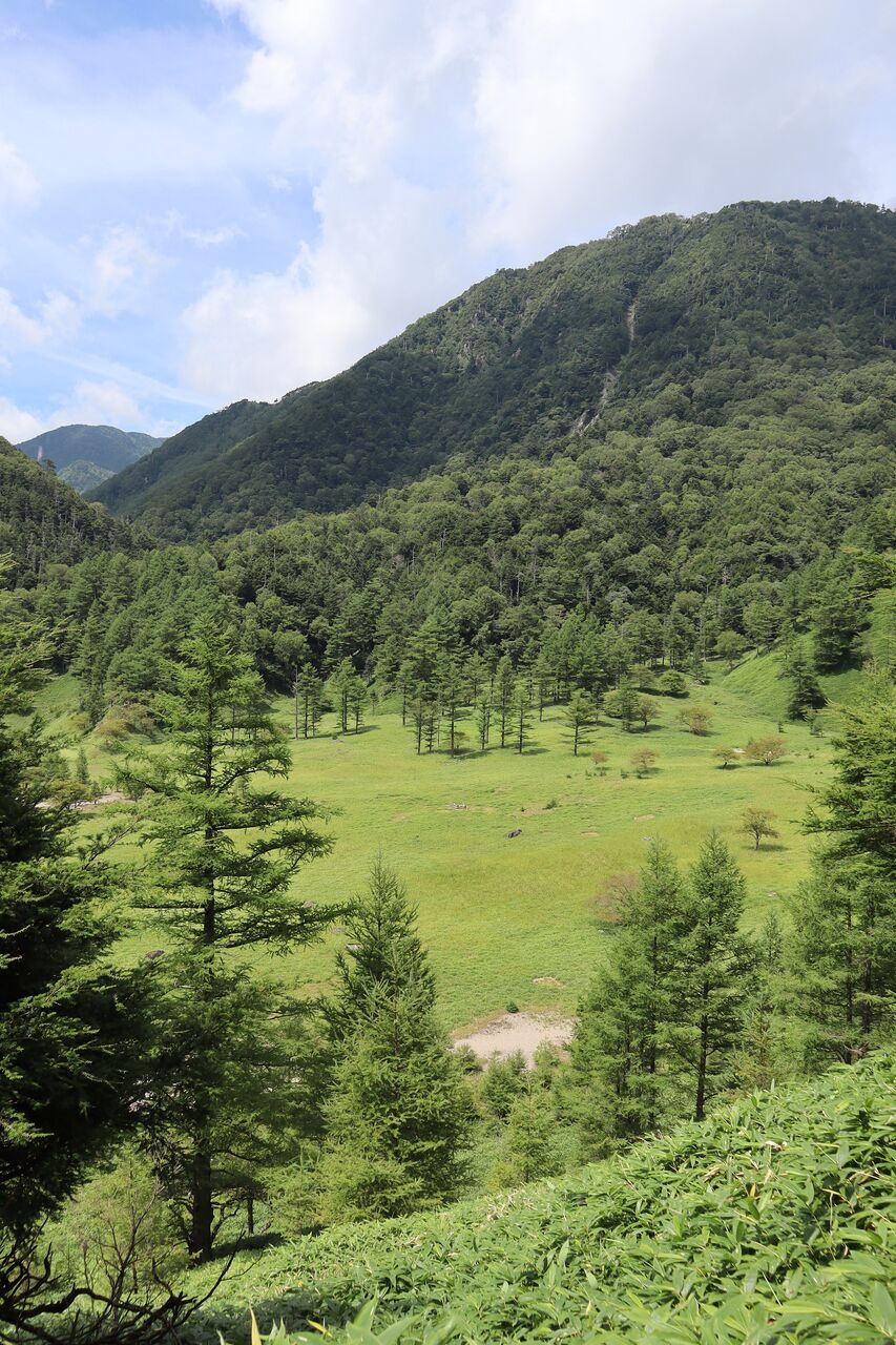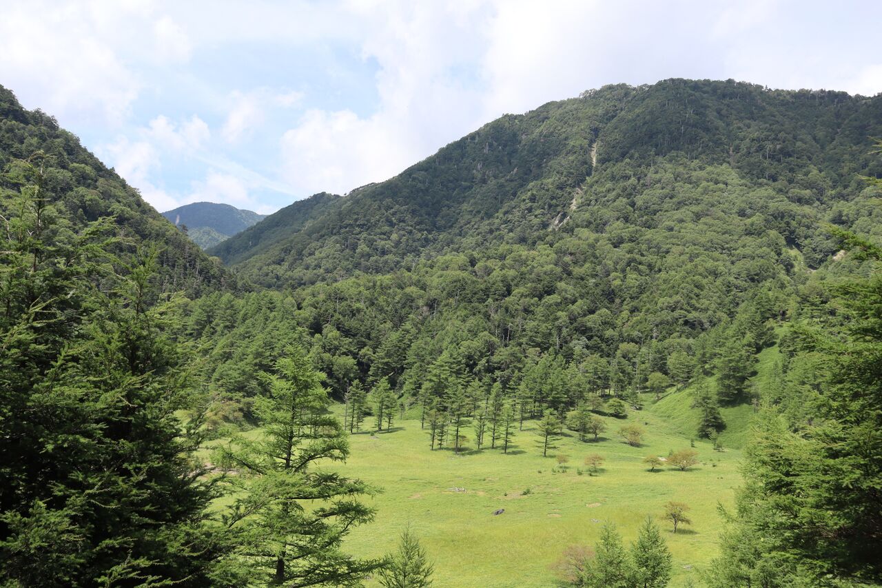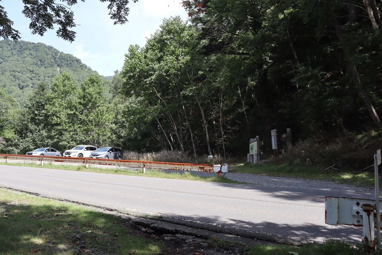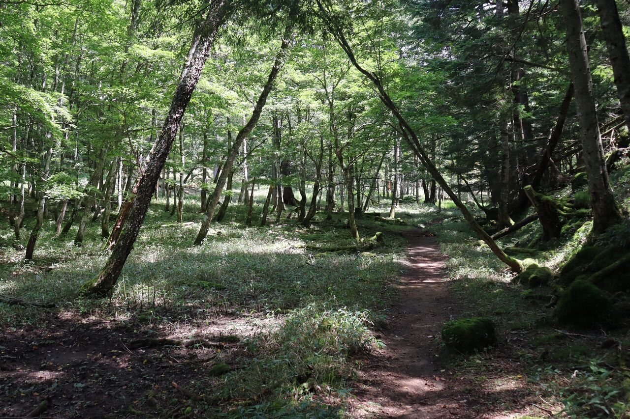 光徳へ向かって下る。カラマツ林の日影も決して涼しくはなかった。