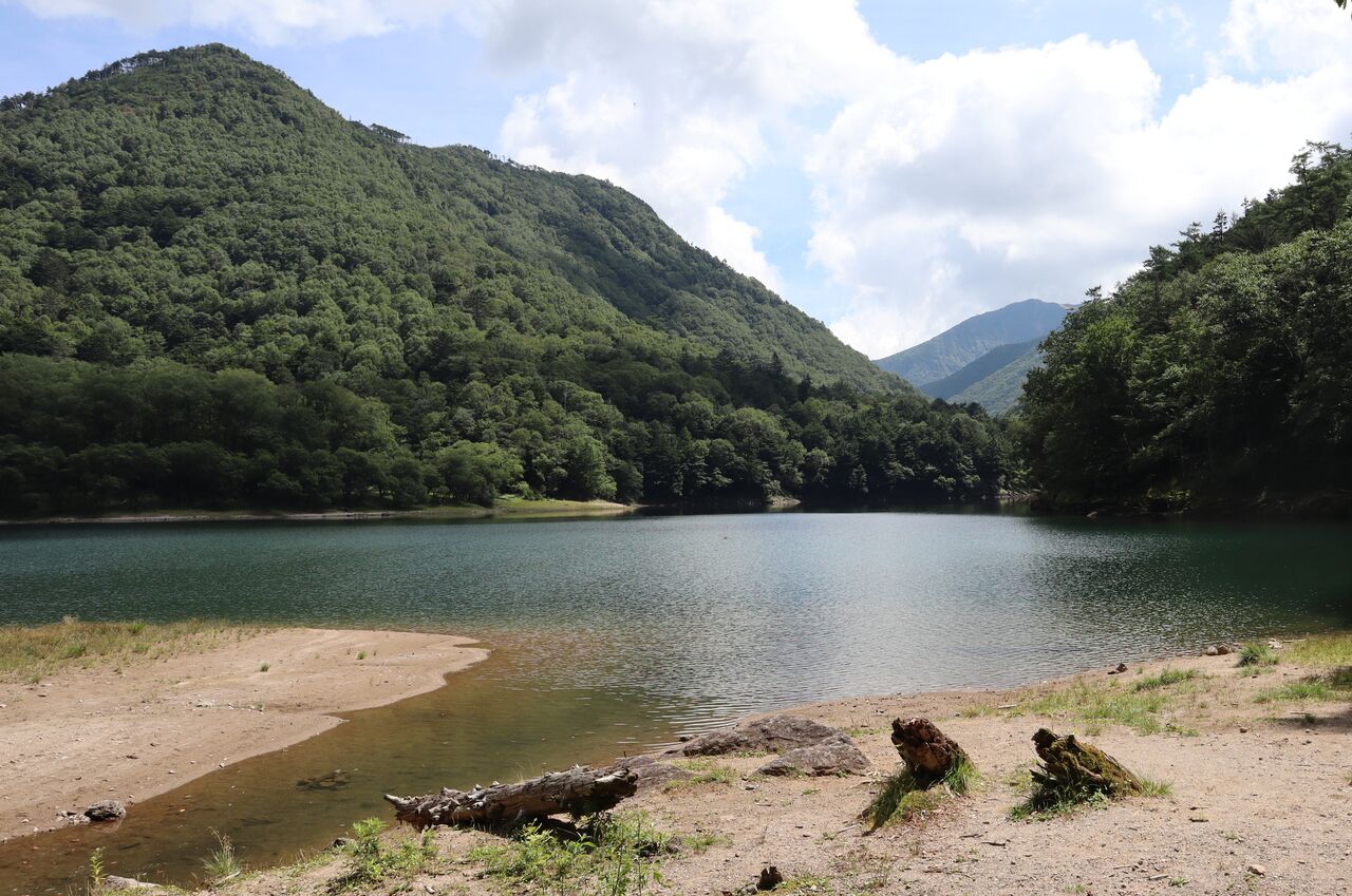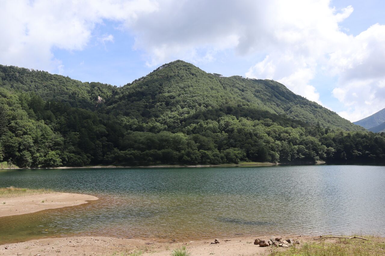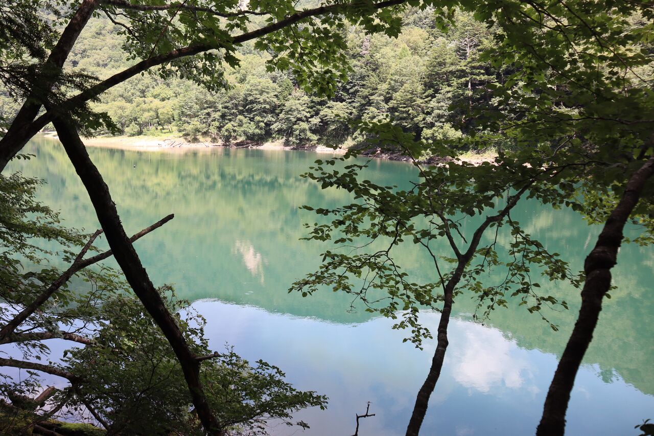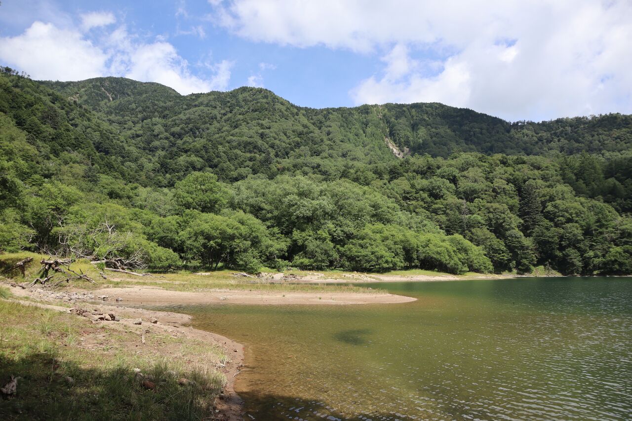 湖畔道から切込湖東端に下る。手前に2207m峰。奥に温泉ヶ岳。おっ、オバチャンも湖畔に降りてきたよ。