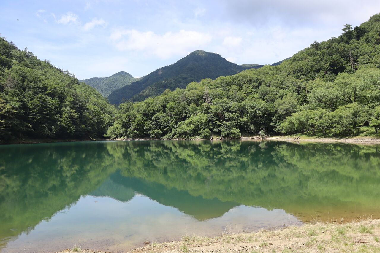 ヤットコサ感満載で刈込湖に到着。奥に山王帽子山と太郎山か?