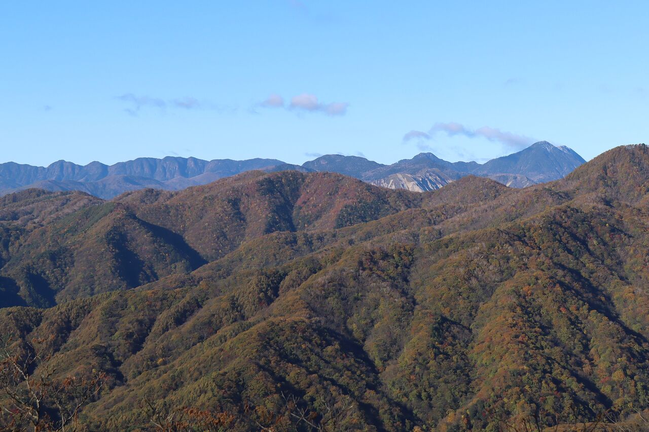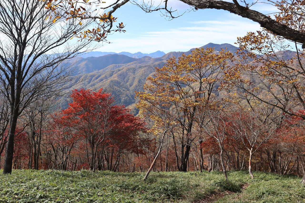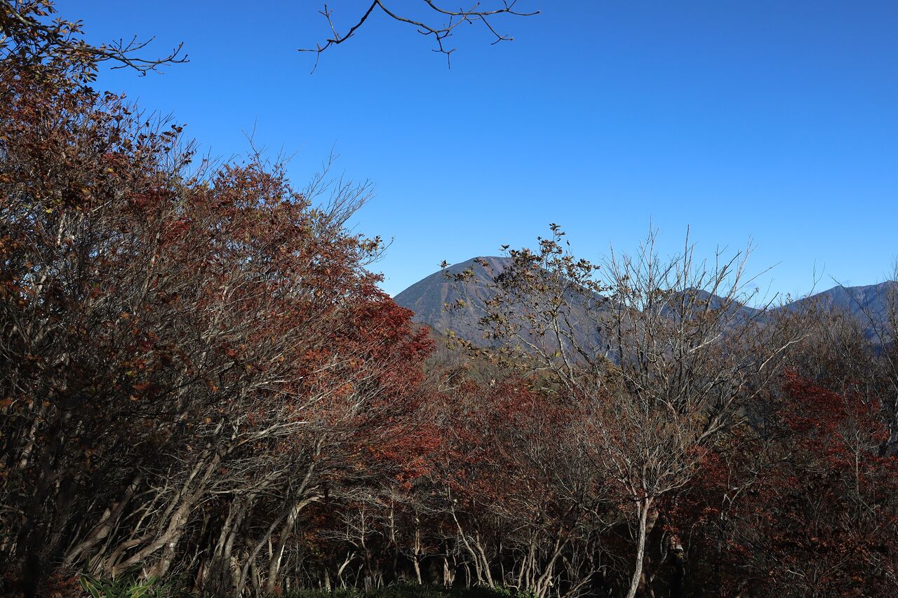 薬師岳を離脱。西側に袈裟丸連山から庚申山、皇海山。皇海山がわずかに白くなっていた。赤倉山付近には黄色いボンボンが見えた。赤いボンボンは無し。