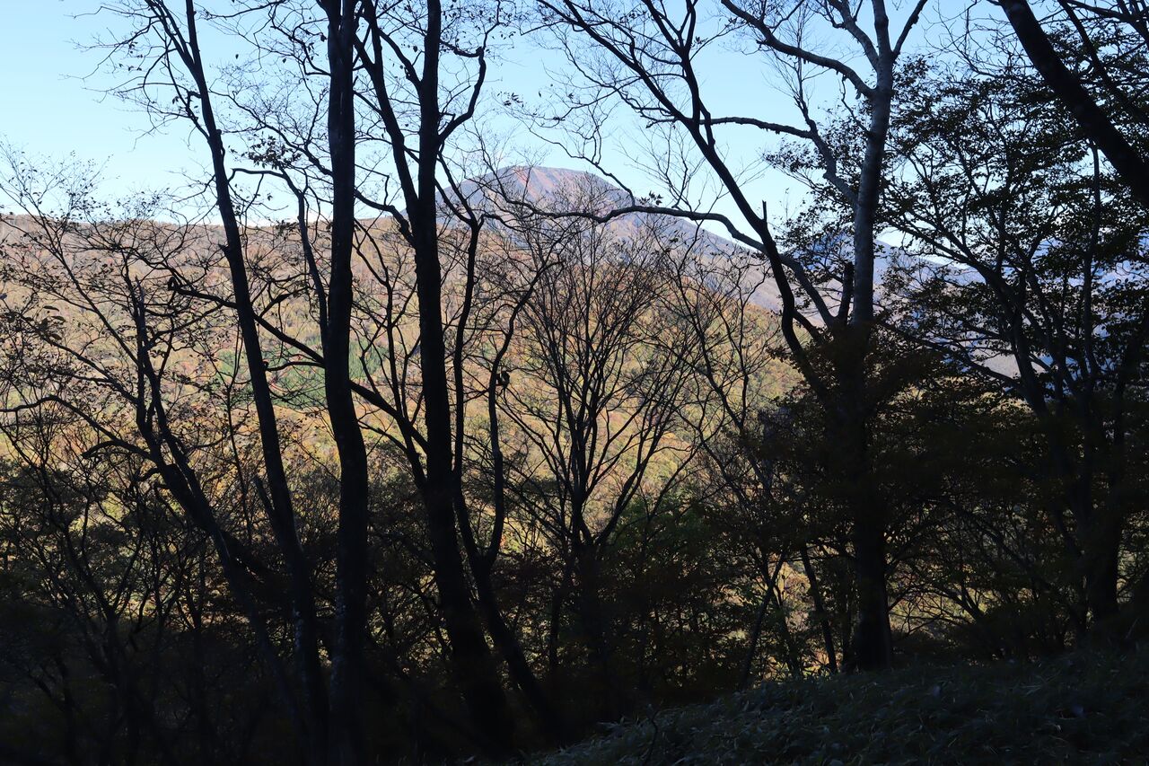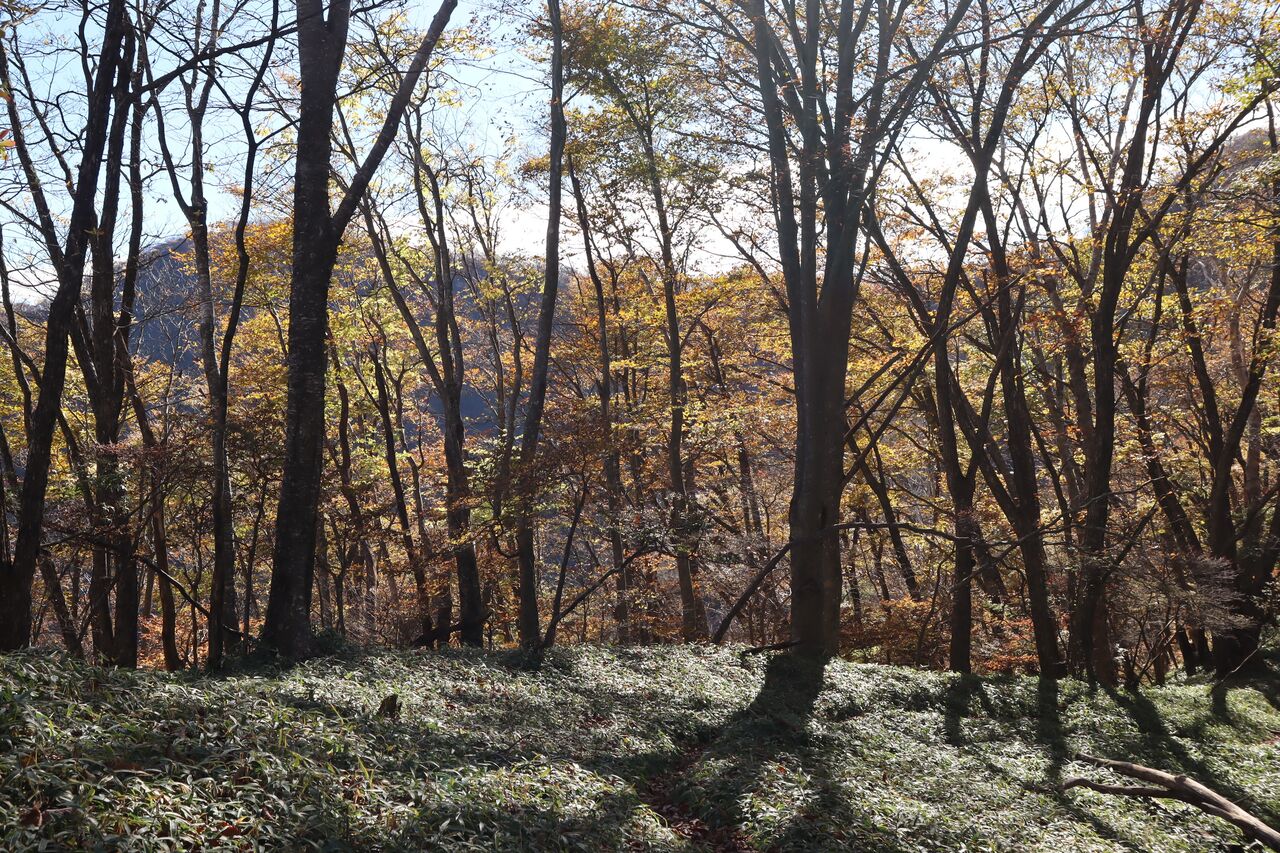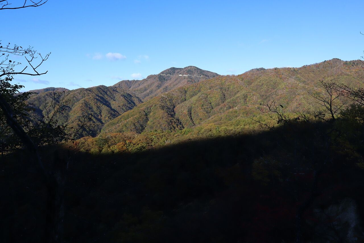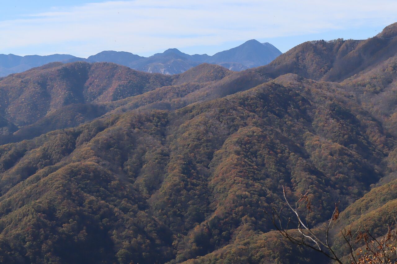 薬師岳を離脱。西側に袈裟丸連山から庚申山、皇海山。皇海山がわずかに白くなっていた。赤倉山付近には黄色いボンボンが見えた。赤いボンボンは無し。