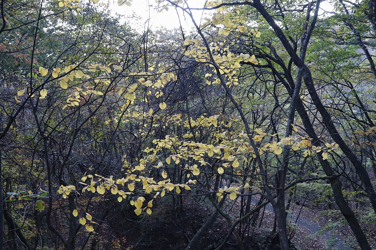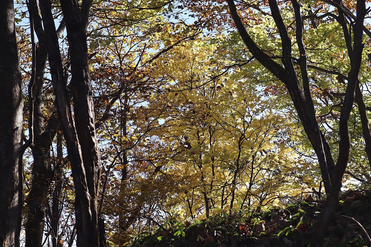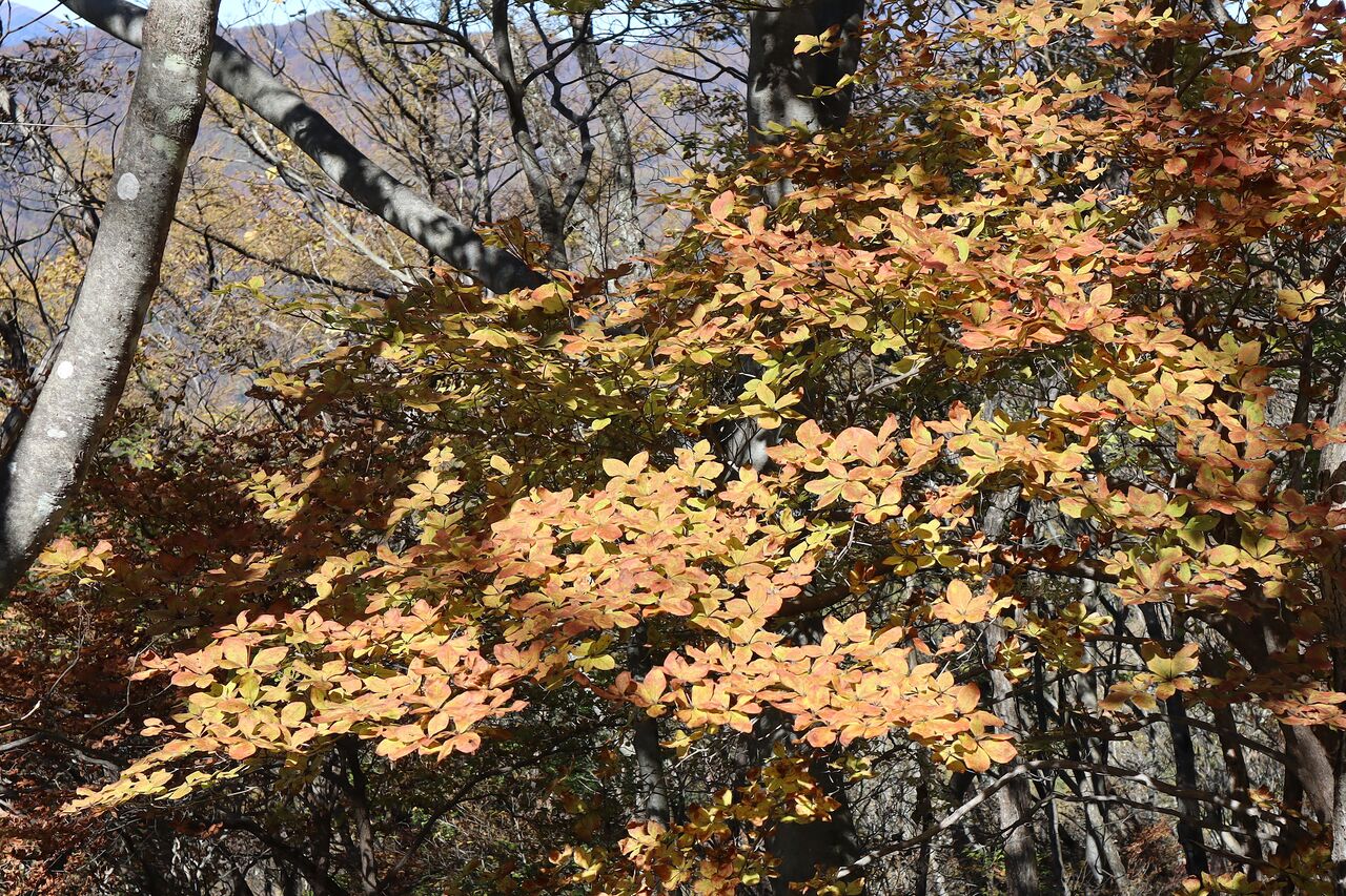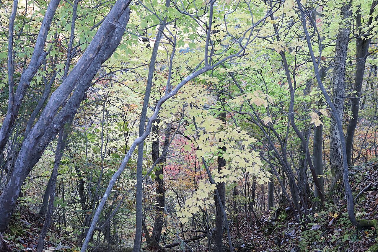 なんだか紅葉しているように見えない。メグスリの木(ミツバカエデ)の葉が薄緑色。