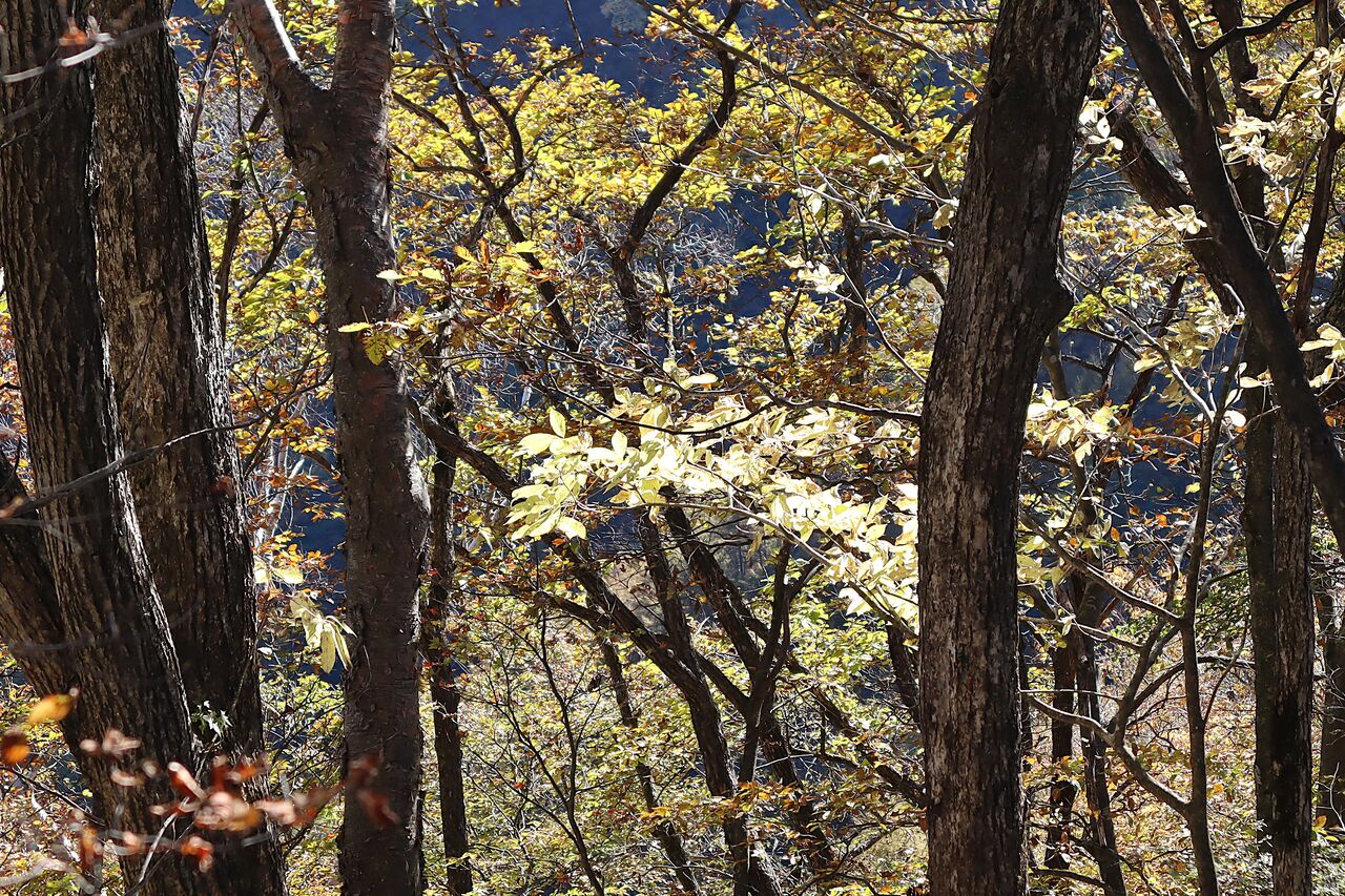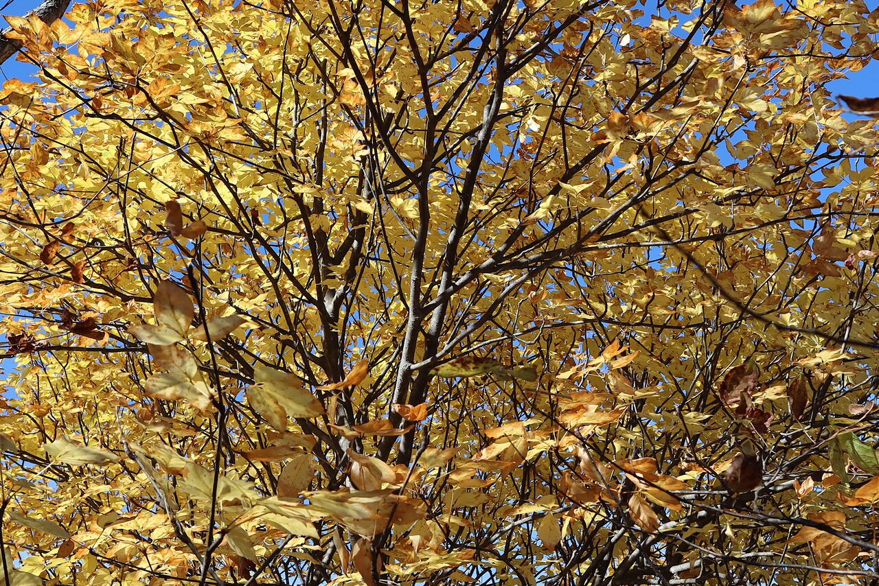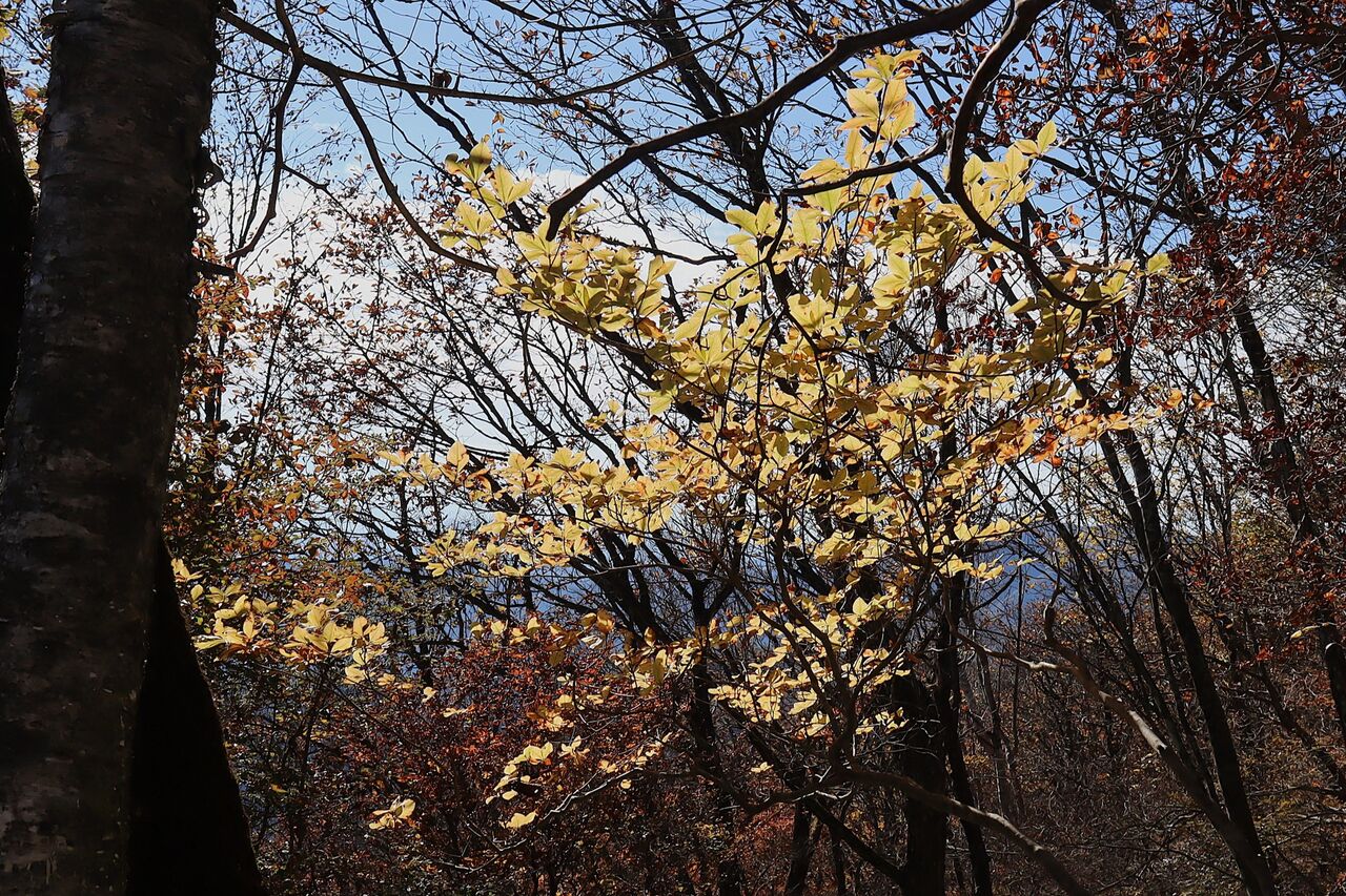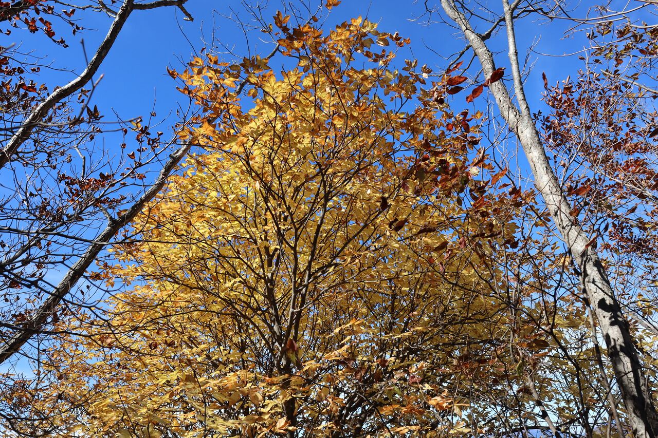 なんだか紅葉しているように見えない。メグスリの木(ミツバカエデ)の葉が薄緑色。