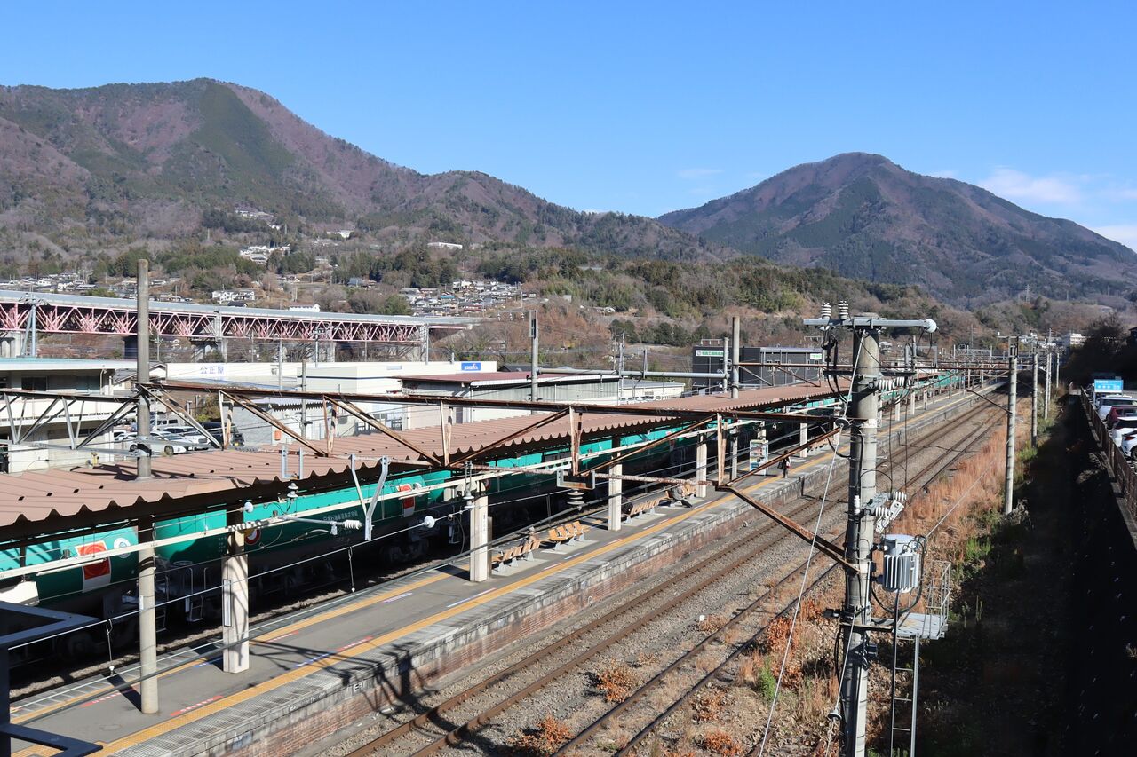 やっとこさ猿橋駅に着きました。右が扇山。左が百蔵山。