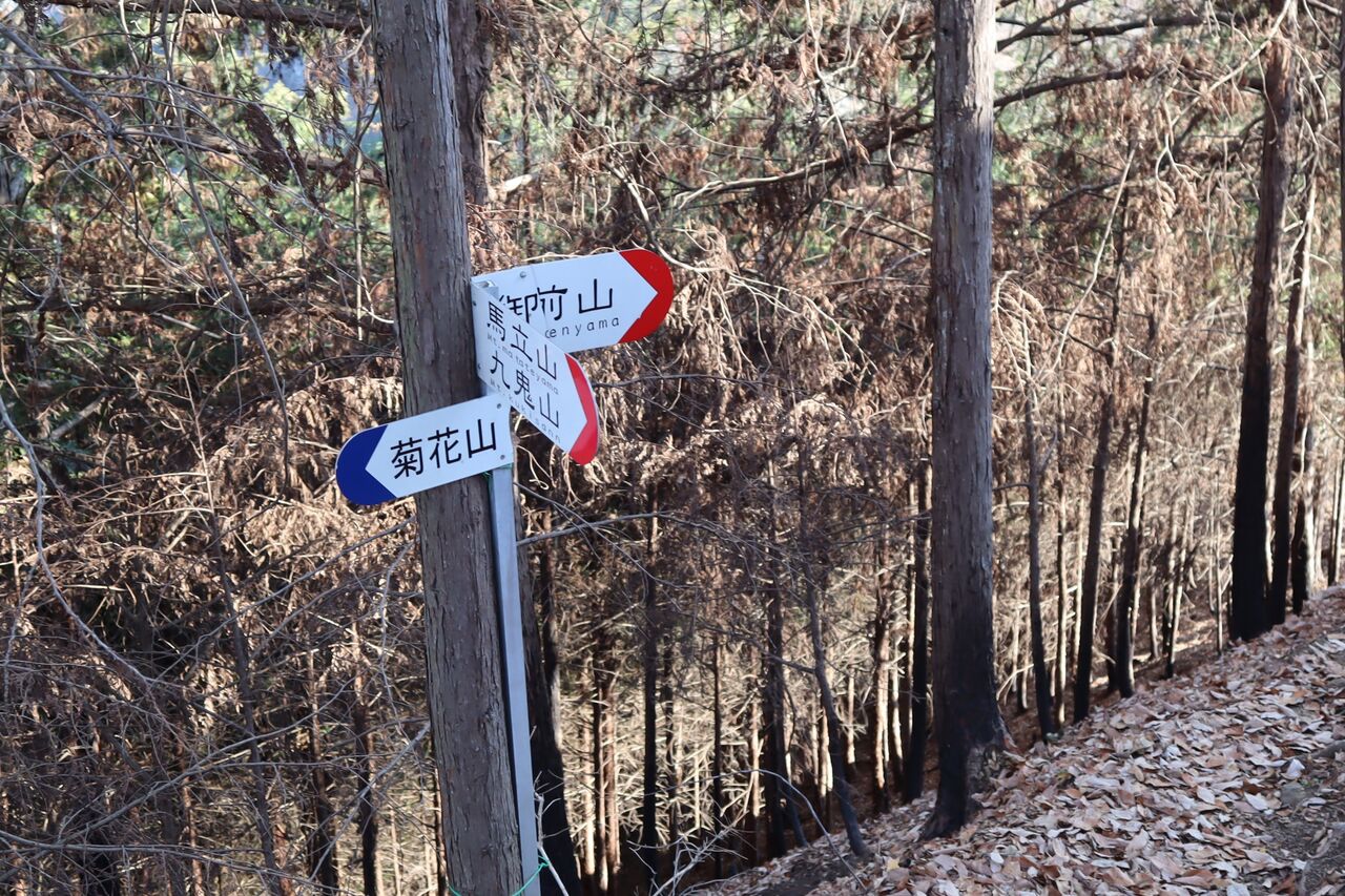 国道脇のコンクリ道を少し進むと、菊花山→が二方向についている。地図を見て、直登コースを選択。