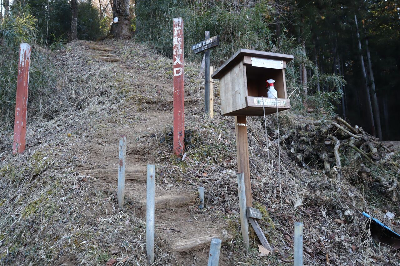 バス停から20分ほどで鷹取山登山口に着いた。箱の中に見えるスプレーはヒル除けのようだ。時節柄、今は大丈夫だろう。それにしてもヒルが拡散しているのではないか。