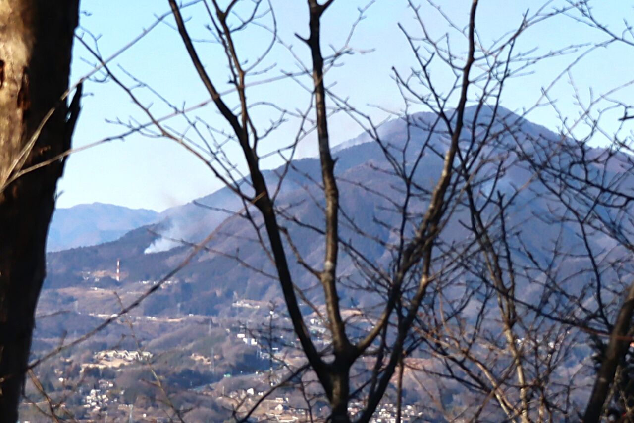 扇山の山火事は広がっているように見える。かなり上の方からも煙が上がっている。また、尾根を乗り越えて北側からも煙が上がっていた。