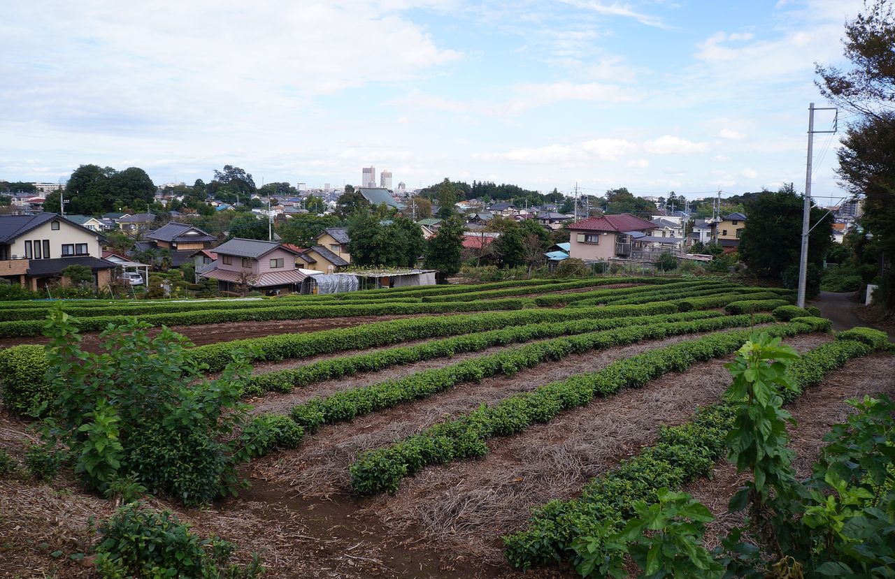 茶畑の向こうに所沢の市街。