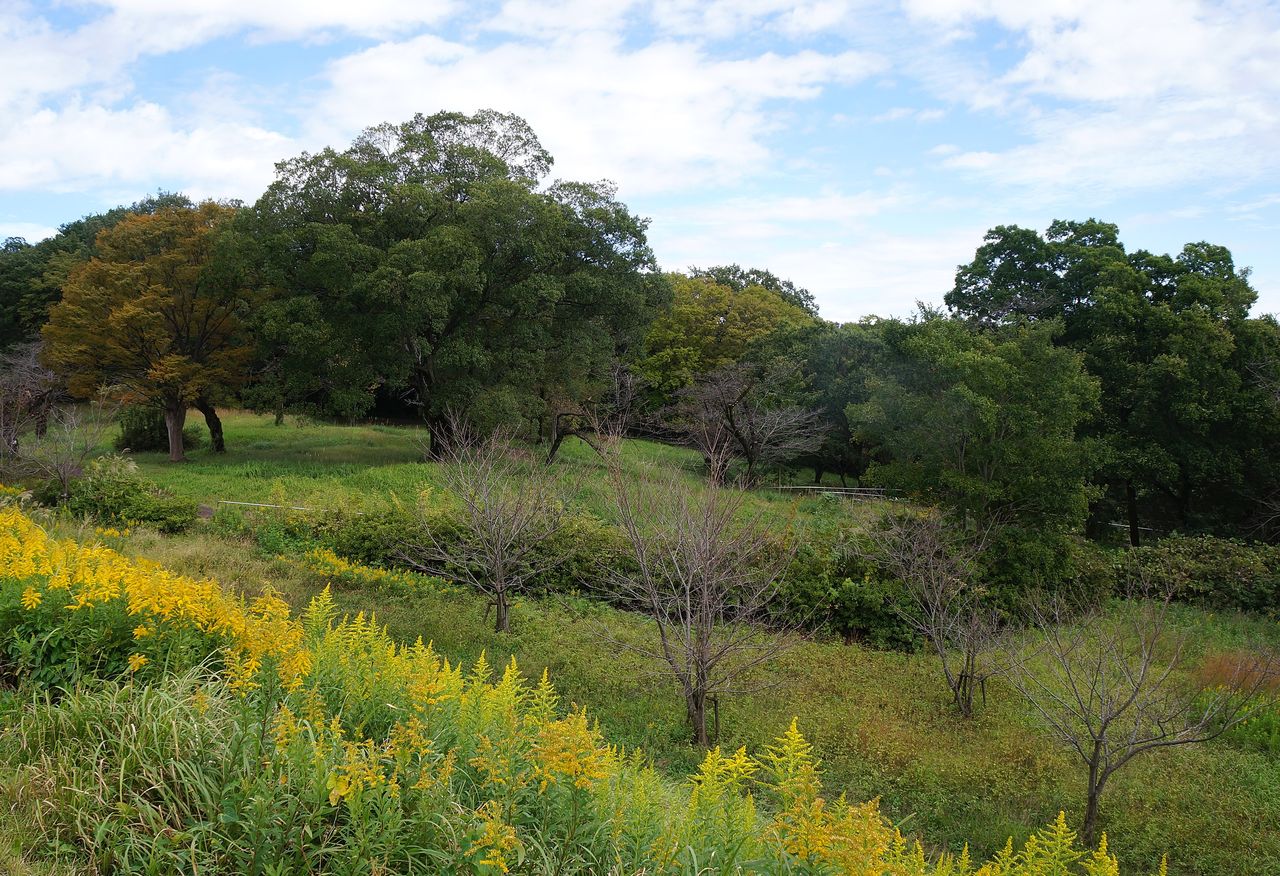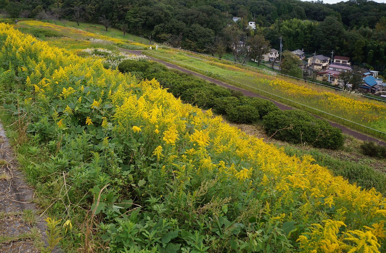 狭山湖堰堤にて。セイタカアワダチソウも時には美しい。堰堤の真下に所沢の街並み。