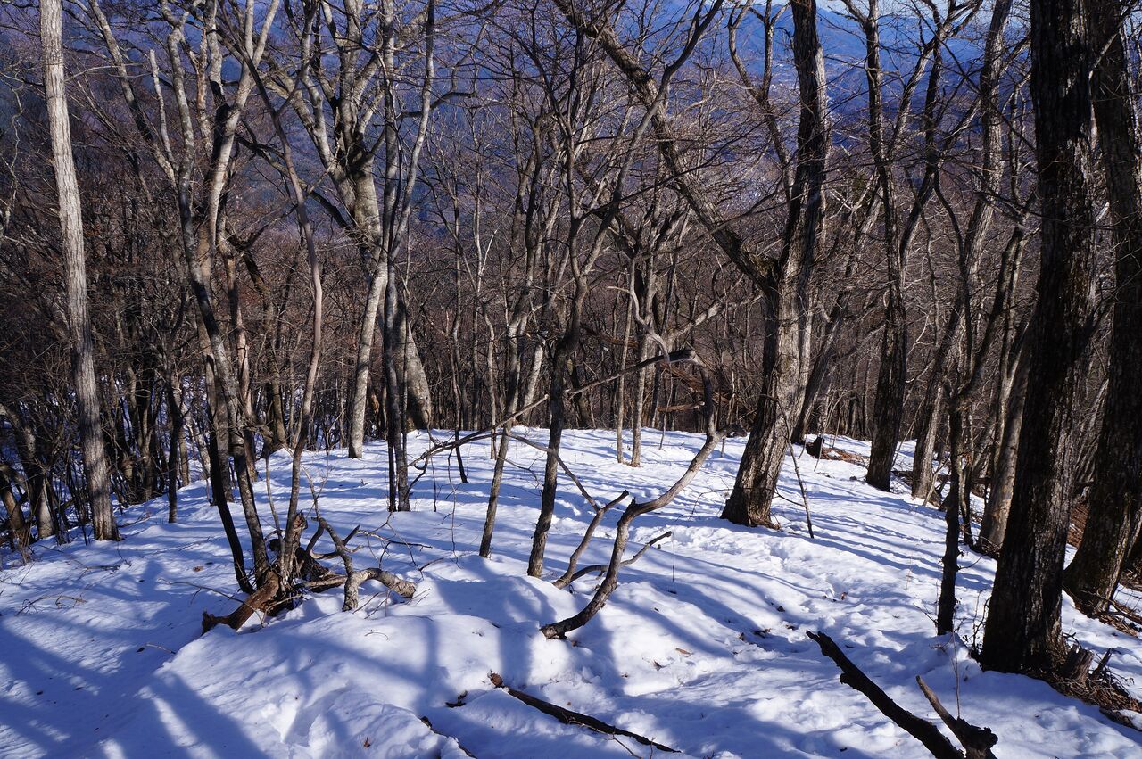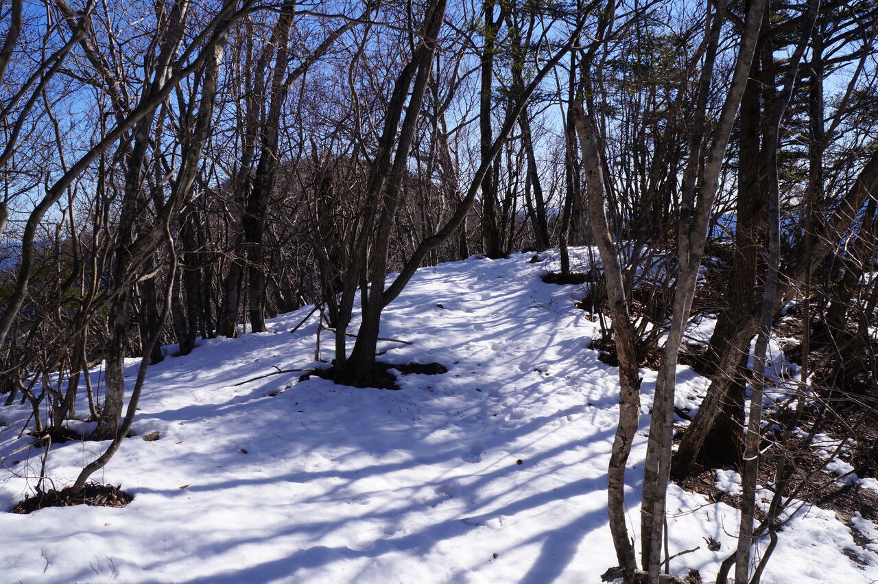 しかし、悪い事だけでは無かった。主稜線の南側には全く雪が無かったのだ。鶴ヶ鳥屋山の先に南面を下るコースがあったからだ。そうだ、そうしよう。
