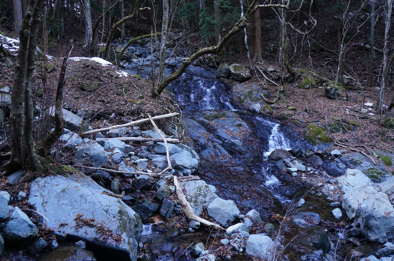 鶴ケ鳥屋山。昭文社マップで見る限り、林道も通っていて特に問題や迷うところがありそうには思えないのですが、どうなのでしょうか。迷いは積雪からのものなのでしょうか。最初の迷いの沢辺りはまだ雪もないし。「堰堤は左岸を通る」となっていますが、これでしょうか。台風で実線の登山道も壊滅的になったということも考えられるし。山の名前を知ってはいても歩いたことのない山域ですから、何とも言えないのがもどかしいところです。