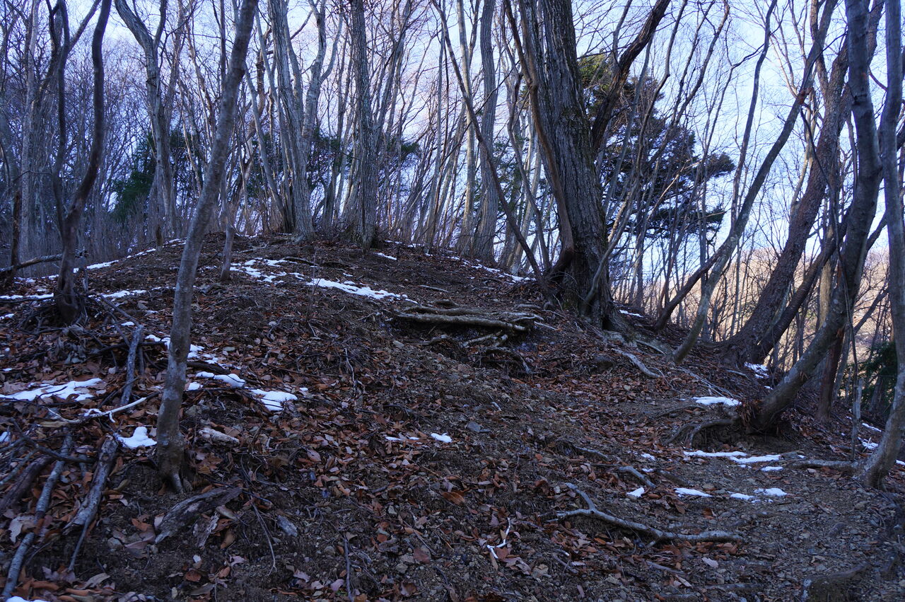ようやくにして、主稜線に這い上がった。本来はここより西側の宝越に出るはずであったが、道型は全く分からず、ここに出た。富士山が樹間から僅かに見えた。手前は三ツ峠山の張り出し尾根か。