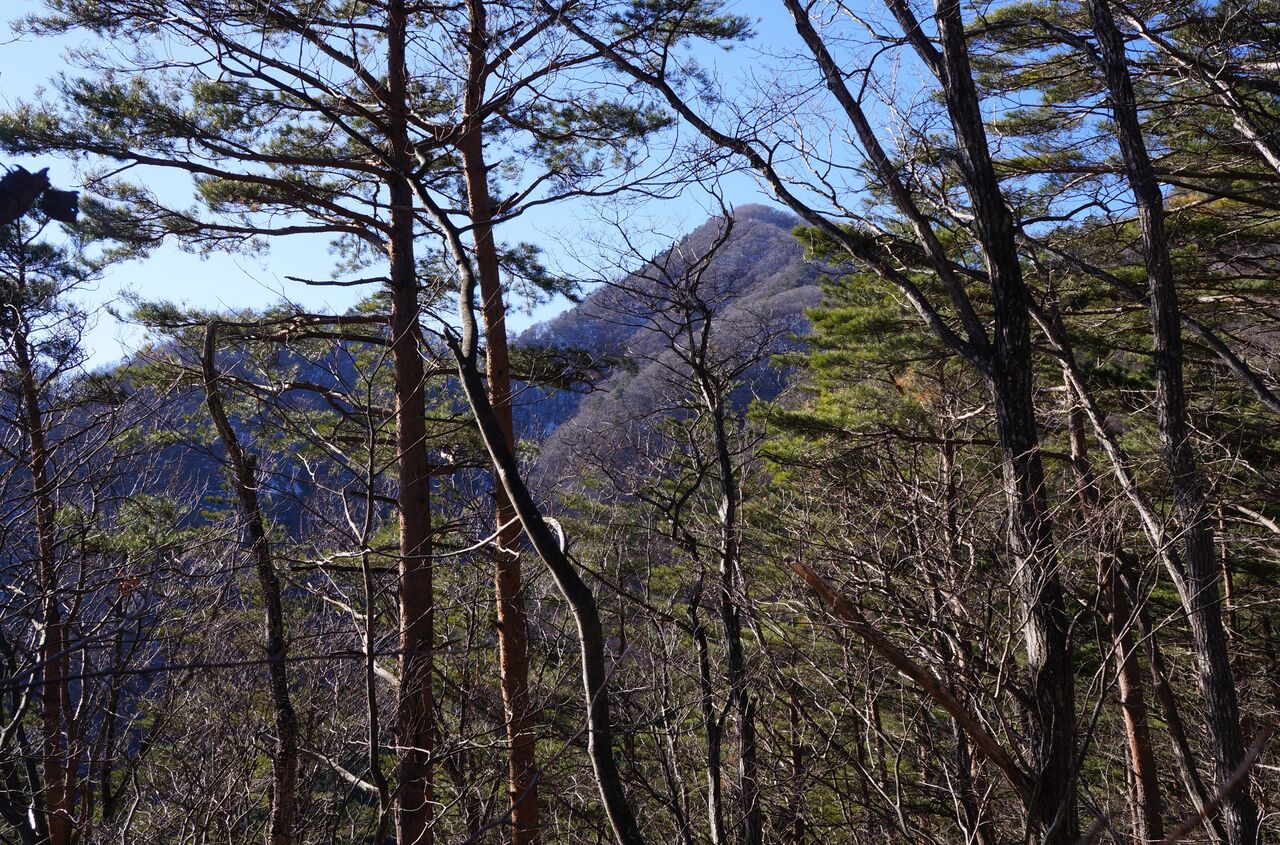 車道に出て、滝子山。雪は見えない。あの裏側にごっそり雪がありそうだねぇ~。