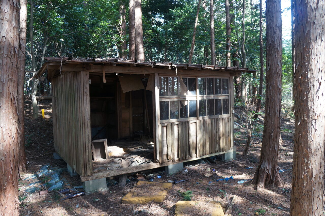 なおも下ると、一升ビンが大量に埋まった廃屋。