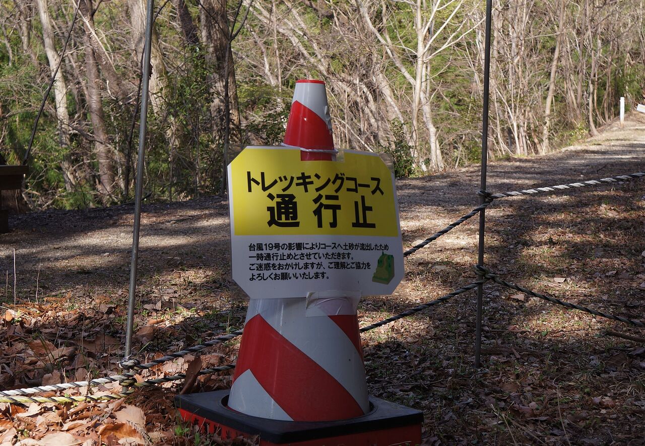 未舗装の林道のような「ときがわトレッキングコース」を七重方向へ進むと、台風19号の影響により通行止め。しかし、ちょうどここは、冠岩へ向かう登山道との分岐であり、事無きを得る。冠岩方向の山道に入る。